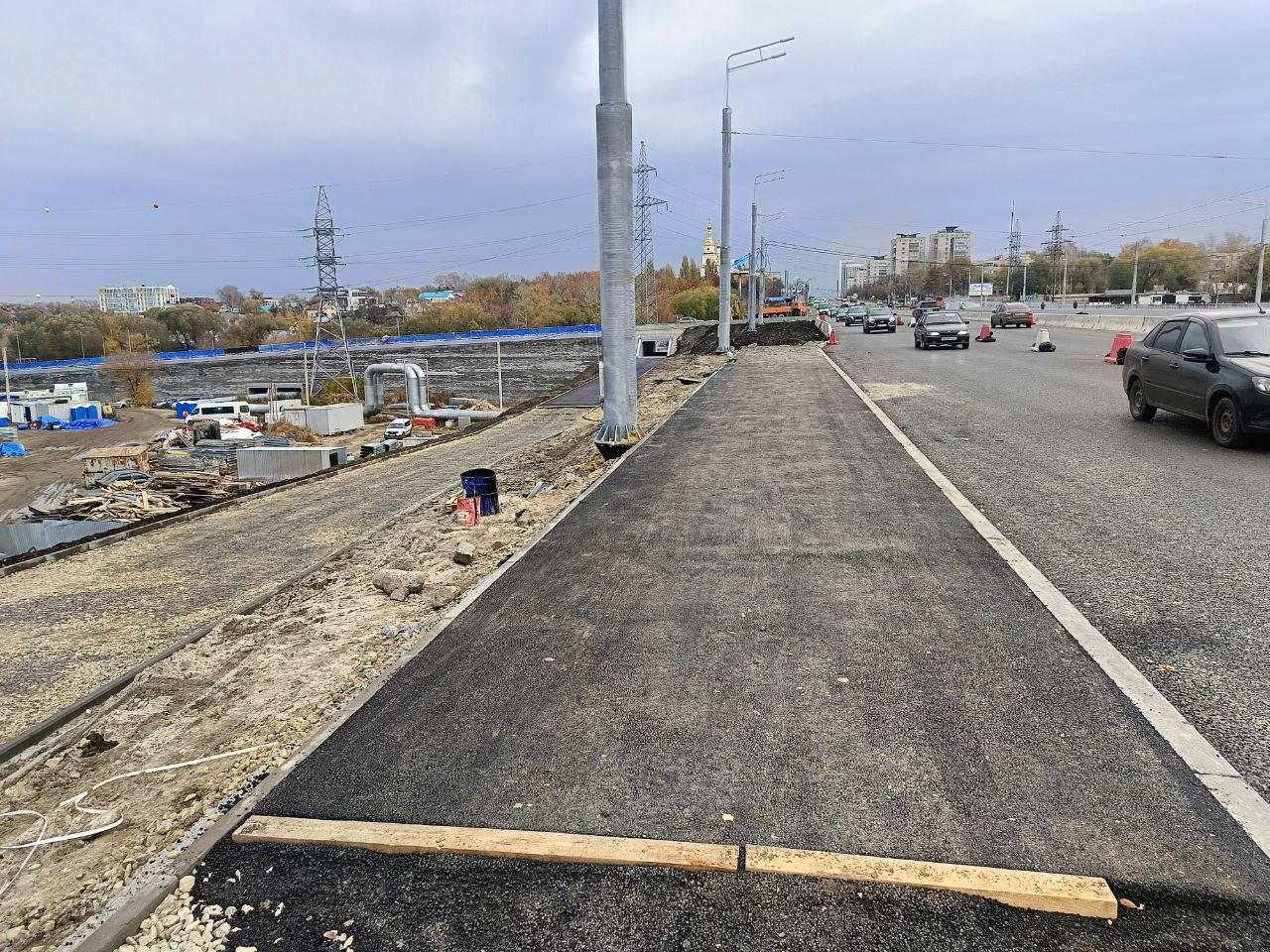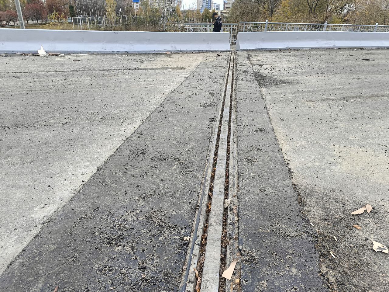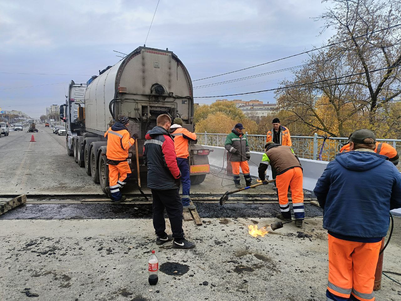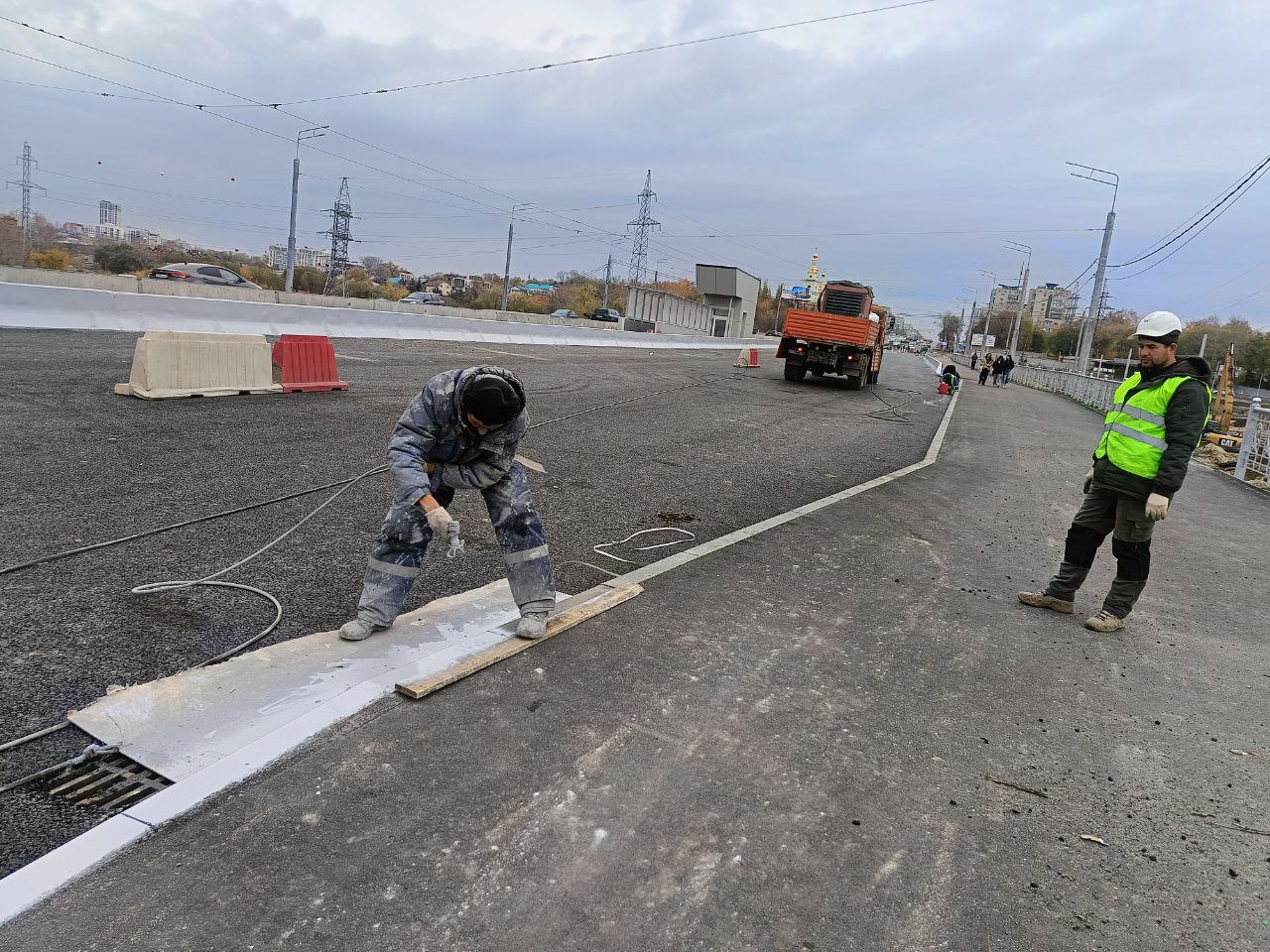 Доставленный в термос-миксере литой асфальтобетон в настоящее время укладывают на примыкании к последнему деформационному шву на русловой части переправы. Также на участке моста со стороны УлГУ завершается покраска блоков типа «нью-джерси», отделяющих проезжую часть от пешеходной и трамвайных путей.