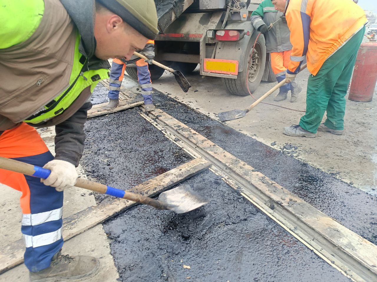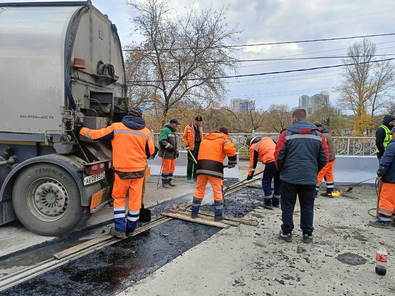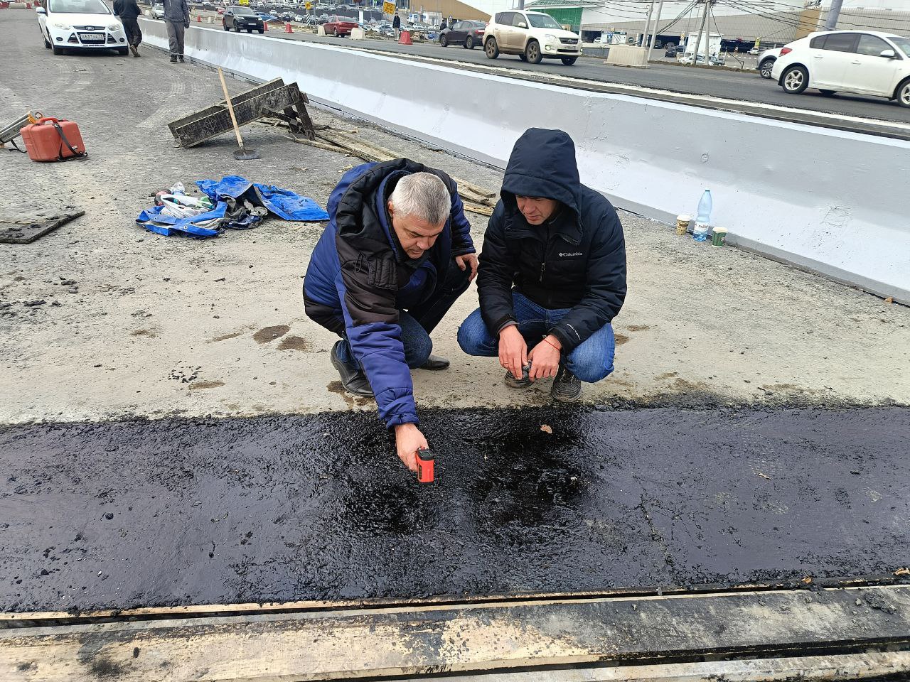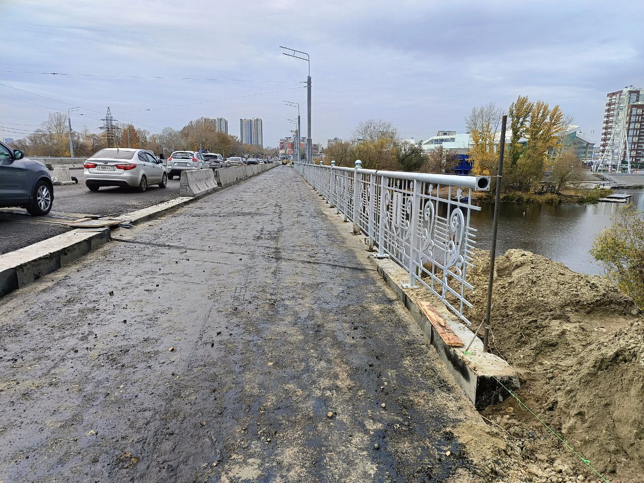 Доставленный в термос-миксере литой асфальтобетон в настоящее время укладывают на примыкании к последнему деформационному шву на русловой части переправы. Также на участке моста со стороны УлГУ завершается покраска блоков типа «нью-джерси», отделяющих проезжую часть от пешеходной и трамвайных путей.