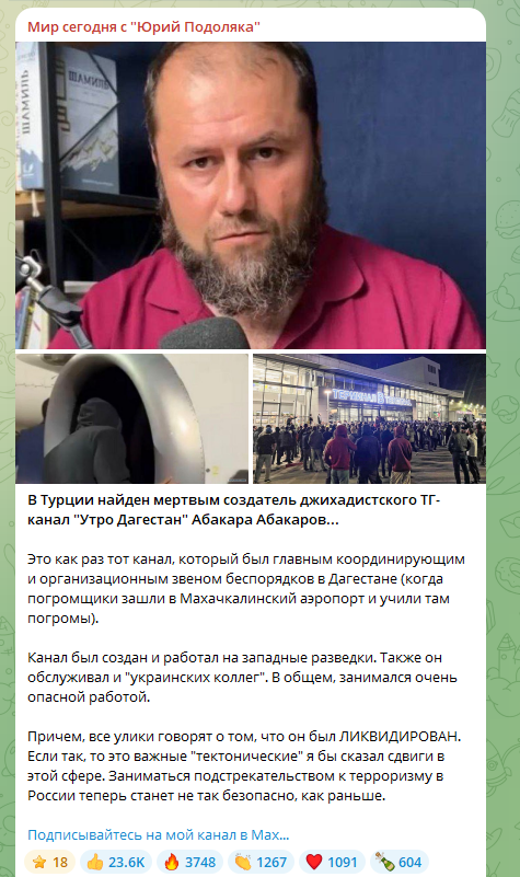 И вот один из наиболее активных подстрекателей, имевший непосредственное отношение к призывам к насилию в том самом канале, радикал Абакаров, найден мёртвым. Юрий Подоляка напомнил, что канал и его основатели работали на западные разведки. Плюс "обслуживали" интересы украинских спецслужб.