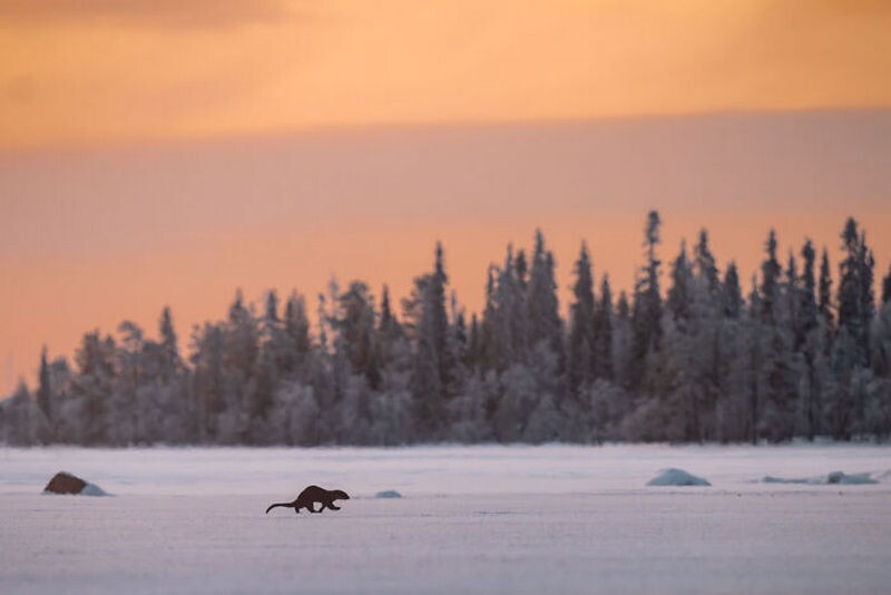Выдра бежит по озеру в -30 градусов