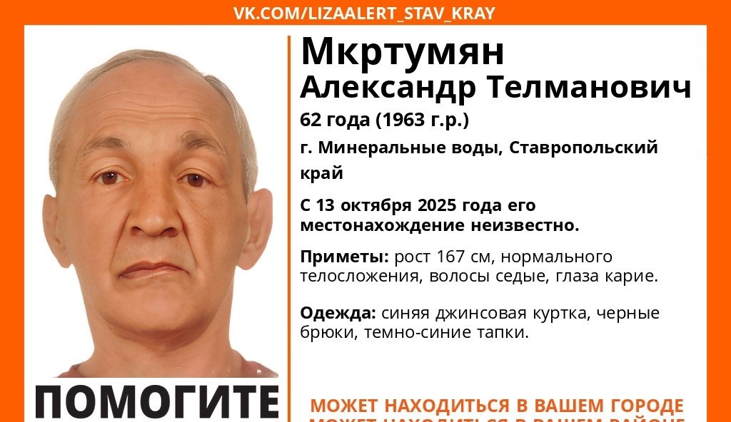 В Минеральных Водах пропал 62-летний Александр Мкртумян. Где находится мужчина – неизвестно с 13 октября. Его ищут волонтеры «ЛизаАлерт», сообщили в группе поисково-спасательного отряда в ВК.