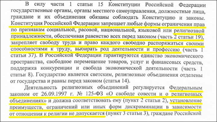 Не формальными отписками в духе "религиозной толерантности". И не мягкосердечным выражением "озабоченности по поводу", а чётким указанием на нарушения закона и безапелляционным "Требую" в конце документа. Любо-дорого почитать, всегда бы так…