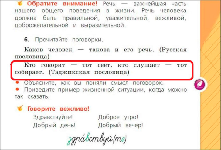 По словам журналистов, эти идеи появились не просто так. Они пришли вместе с той русофобской пропагандой, которую открыто внедряли в сознание детей через школьные учебники. Так, например, в учебнике по русскому языку для 2-го класса, изданном в 2023 году для подтверждения тезиса, что речь должна быть уважительной и вежливой, приведено выражение: "Кто говорит - тот сеет, кто слушает - тот собирает". Обозначенное как таджикская поговорка.