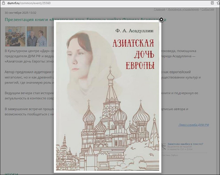 На днях Управление провело серию презентаций книги шейха (исламского богослова) Фарида Асадуллина "Азиатская дочь России". Мудрено догадаться, но название относится… к Москве: "историки от ДУМ" продвигают идею, что русская столица - это "древний евразийский центр, где значимую роль играл тюрко-мусульманский фактор,