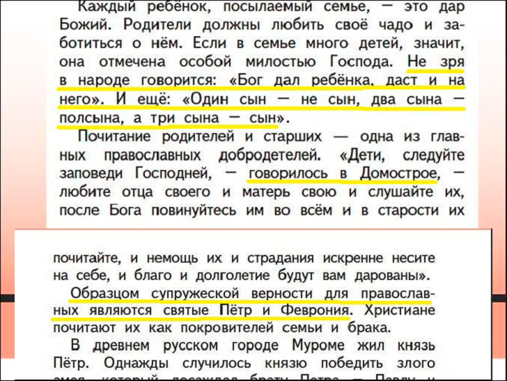 Или вот ещё пример - учебник "Основы религиозных культур народов России" для 5-го класса, изданный в 2023 году. В одном из разделов учебника авторы рассказывают о семье и священном характере брачного союза мужчины и женщины в каждой религиозной традиции.