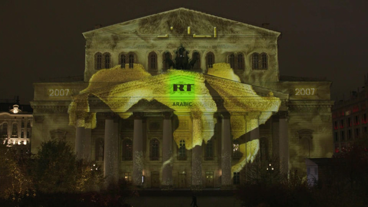 В завершение не только гости, но и все, кто оказался в тот вечер в центре Москвы, могли полюбоваться на эффектную 3D-проекцию на здание Большого театра: основные вехи развития RT, различные континенты и страны, на которые так или иначе вещает телеканал, будь то на Западе или на Глобальном Юге.
