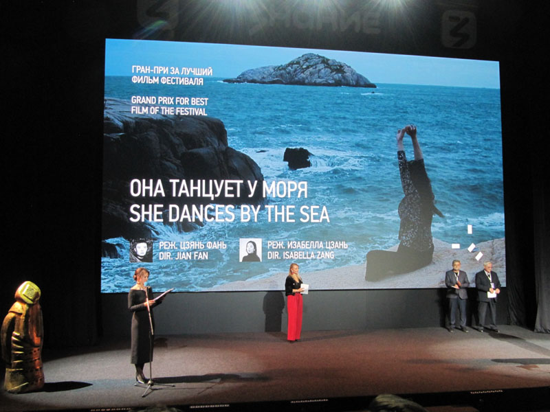 Через несколько дней стало известно решение международного жюри: китайский фильм «Она танцует у моря» признан лучшим фильмом юбилейной «Флаэртианы» и стал обладателем Гран-при – статуэтки «Золотой Нанук». Денежная премия в размере 250 тысяч рублей досталась режиссерам Цзянь Фань и Изабелле Цзань, которые не смогли приехать в Пермь, находясь в далеком путешествии, но выразили свою радость через видеообращение.