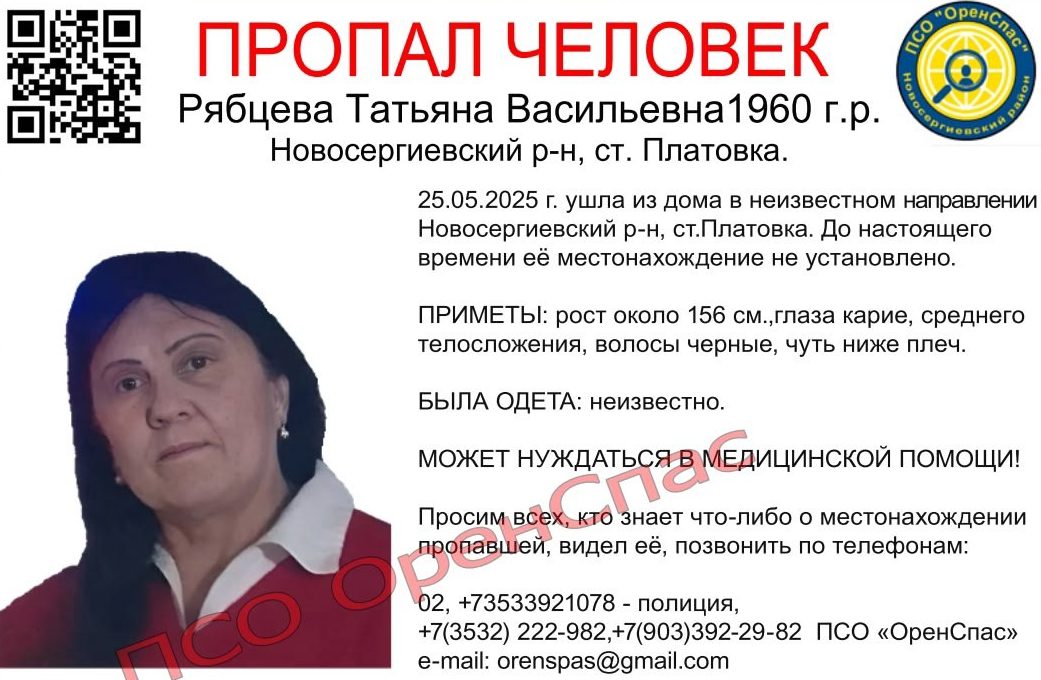 Всех, кто знает что-либо о местонахождении пропавшей, видел её, просят позвонить по телефонам: 02, +7 (3533) 92-10-78 — полиция, +7 (3532) 222-982, +7(903)392-29-82 — ПСО «ОренСпас».