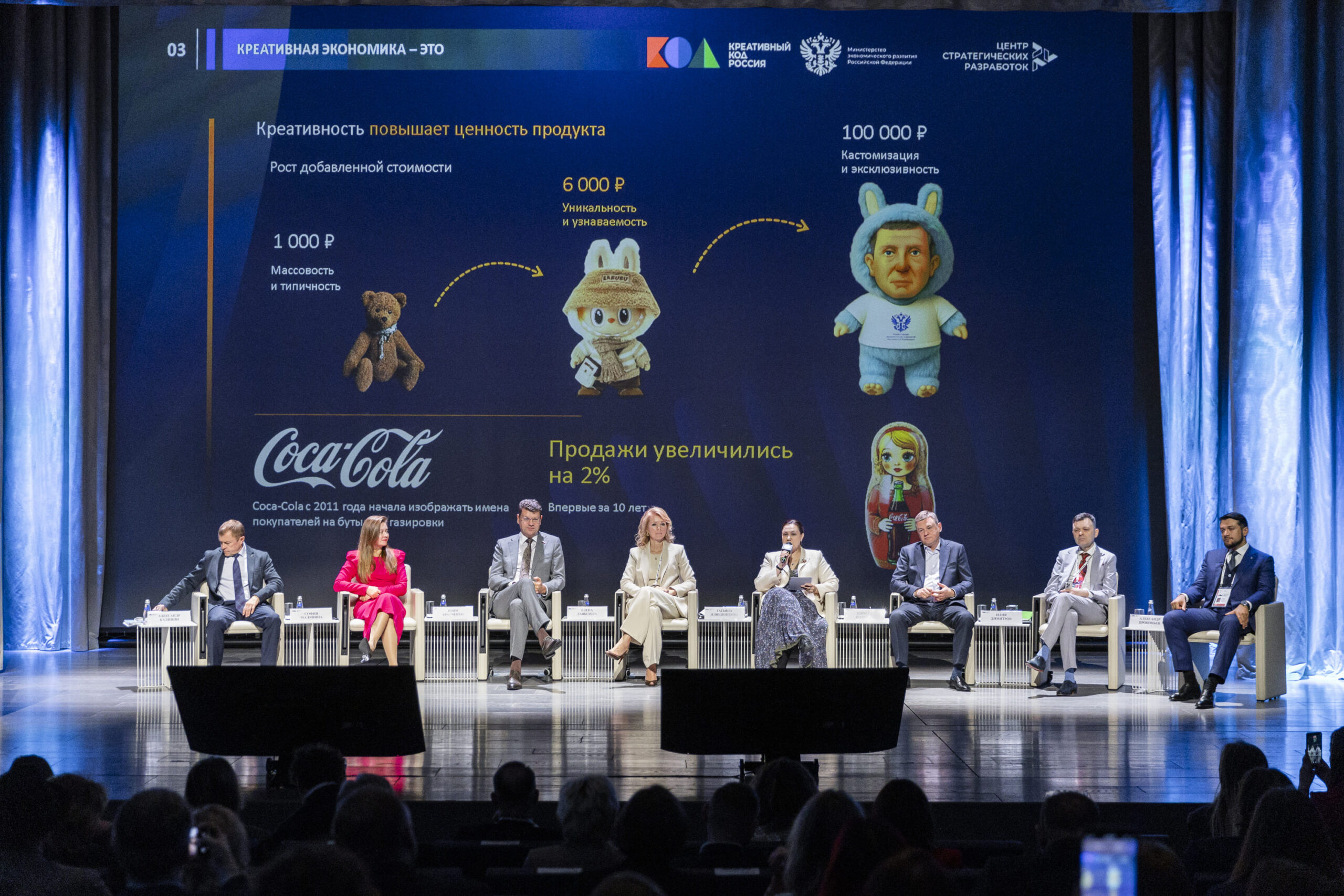 Такие целевые показатели вполне реалистичны и обоснованны, если учесть, что сектор креативных индустрий растёт в четыре раза быстрее, чем российская экономика в целом, отметила заместитель министра экономического развития РФ Татьяна Илюшникова. Тем не менее весь потенциал этого сектора пока не раскрыт, и форум «Креативный код. Россия» должен поспособствовать поиску точек роста и эффективных решений.