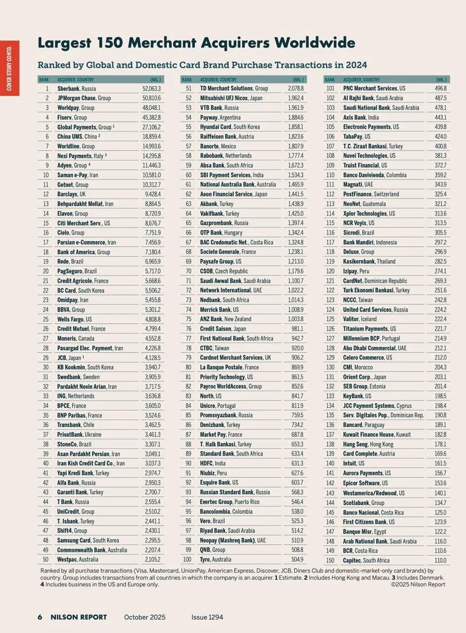 Другие отечественные игроки расположились ближе к середине и нижней половине рейтинга. Альфа-банк занял 42-ю позицию с 2,9 млрд транзакций, Т-банк — 44-ю с 2,5 млрд. Оба банка замедлили темпы роста: показатель увеличился на 32% против двукратного увеличения и 4,5-кратного роста соответственно годом ранее. При этом Альфа-банк поднялся на две строчки, Т-банк — на восемь.