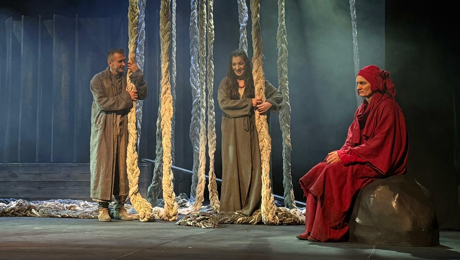 Сценография художника Лилии Хисматуллиной минималистична и сюрреалистична. В синем тумане таинственного леса, созданного при помощи заплетенных в косы двигающихся канатов, появляются сельчане, облаченные в монохромные одежды «всех оттенков серого». Они монотонно выполняют однообразные движения, олицетворяющие рутину будней и очень похожи на лишенных разума зомби. Деревенские жители до краев наполнены страхом перед могуществом темных сил. Поэтому и ходят в церковь. Интересно в постановке решен сельский храм: темные доски с размытыми светлыми пятнами, на которые не крестятся, как на образа, а поднимают, как рычаги, негнущиеся руки сельчане, надеясь на спасение от неведомых бедствий. Хотя в душе не верят в защиту.