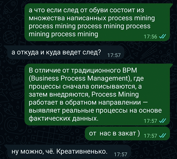 Если по-простому, то Process Mining — это технология анализа и улучшения автоматизированных бизнес-процессов на основе сбора и изучения цифровых следов всех событий процесса. И тогда мы стали думать о понятии «след», оно ведь многогранное. Когда я проходила на юрфаке криминалистику, нас учили, что след может об очень многом сказать, если, конечно, грамотно его осмотреть.