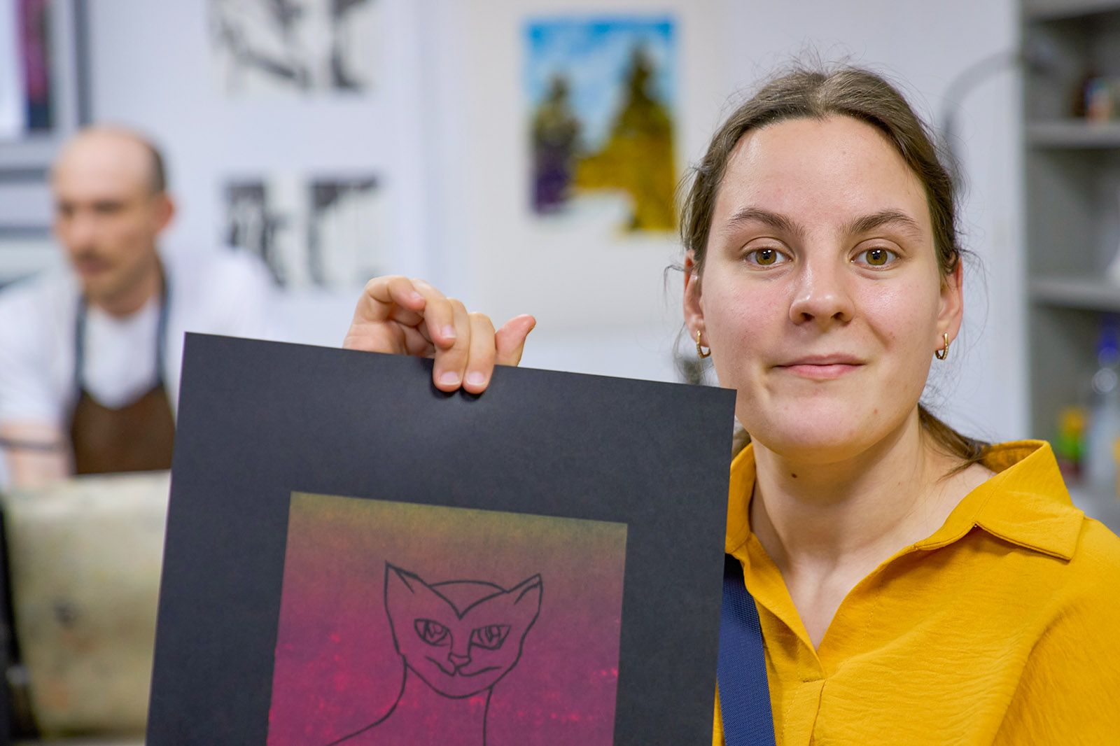 У его соседки, 25-летней Марины Алымовой, получилась эффектная кошка Муся с острыми ушами. «Я люблю котов, у нас дома их было много: и Муська, и Васька, и Мурзик, я по ним сейчас очень скучаю», — рассказывает воспитанница центра.