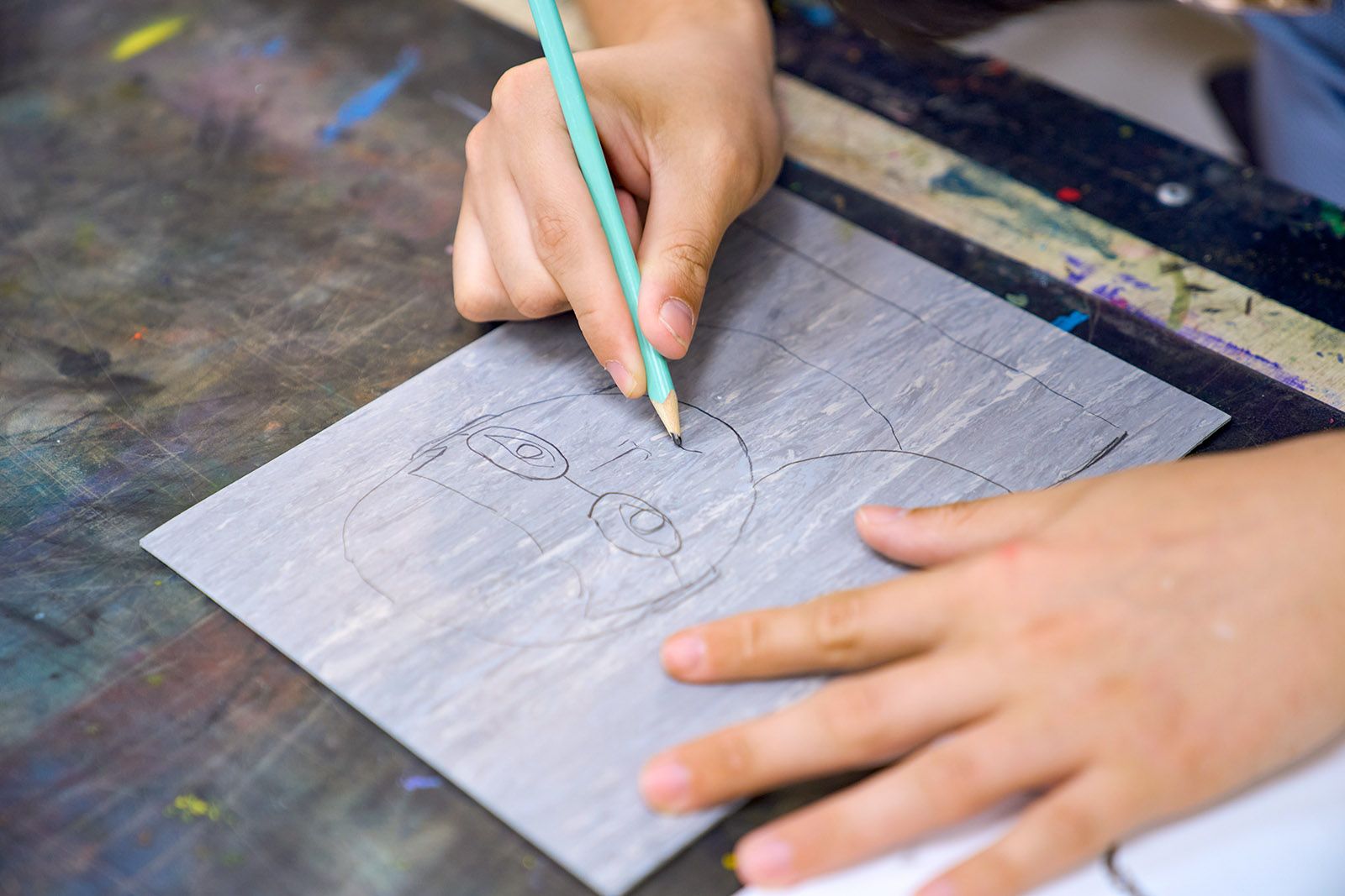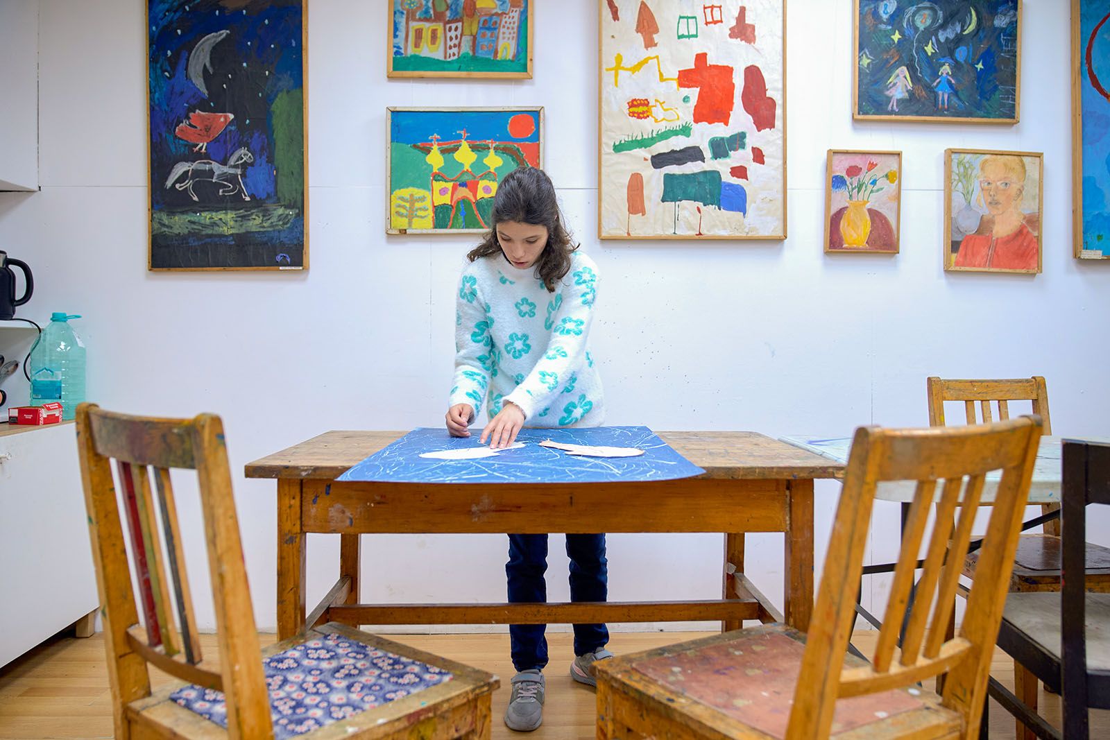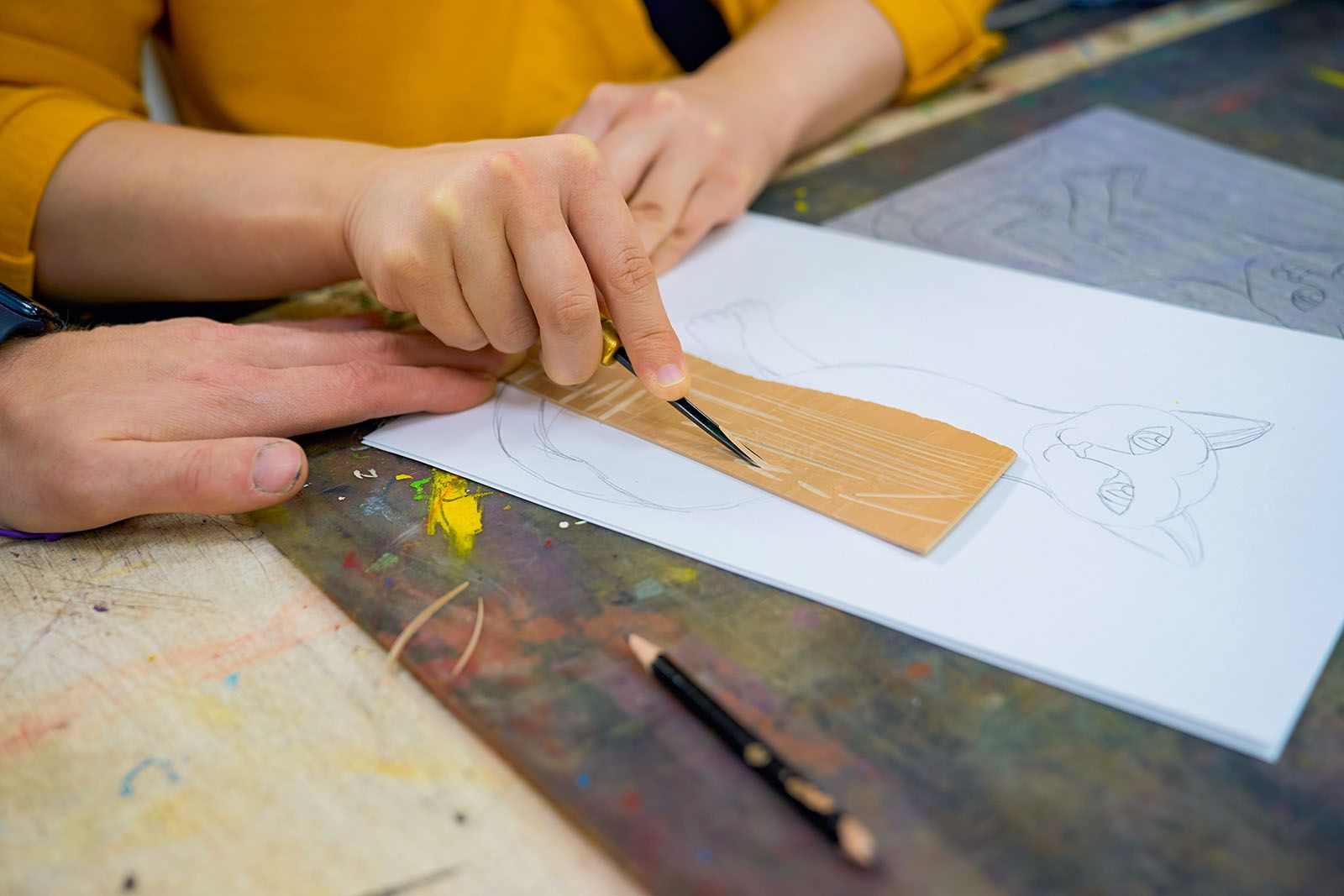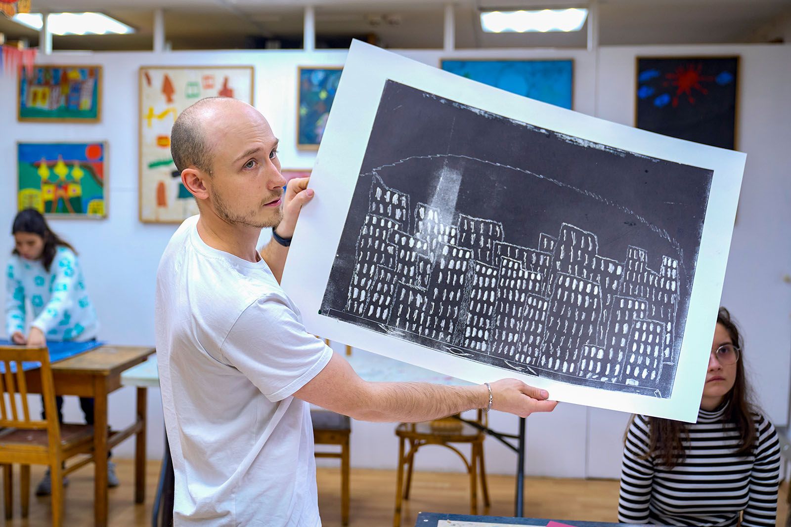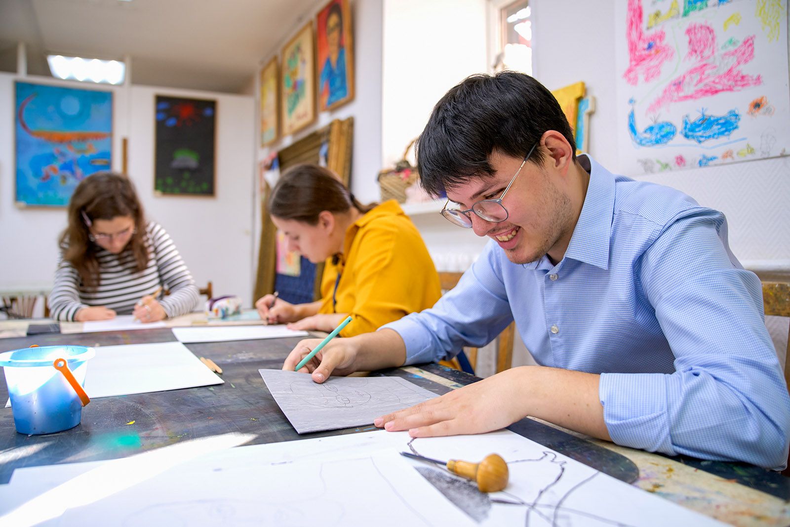В небольшой художественной мастерской, расположенной на 3-й Фрунзенской улице (дом 12), пахнет свежей глиной и красками. За прямоугольным столом, среди картин, гравюр и гипсовых голов, занимаются студенты. Под руководством наставников ребята полностью погрузились в творческий процесс. На пластиковых листах и фрагментах серого линолеума с помощью иглы, шила, гвоздей и деревянных палочек они создают гравюры.