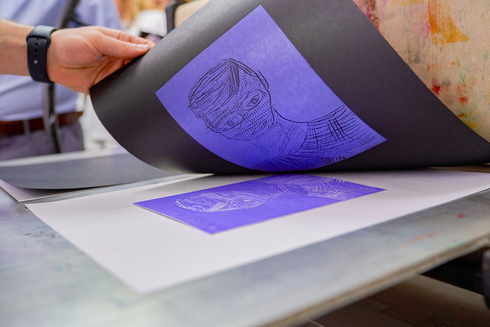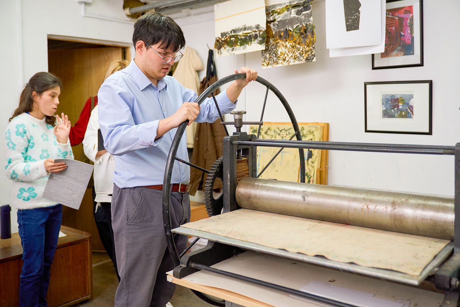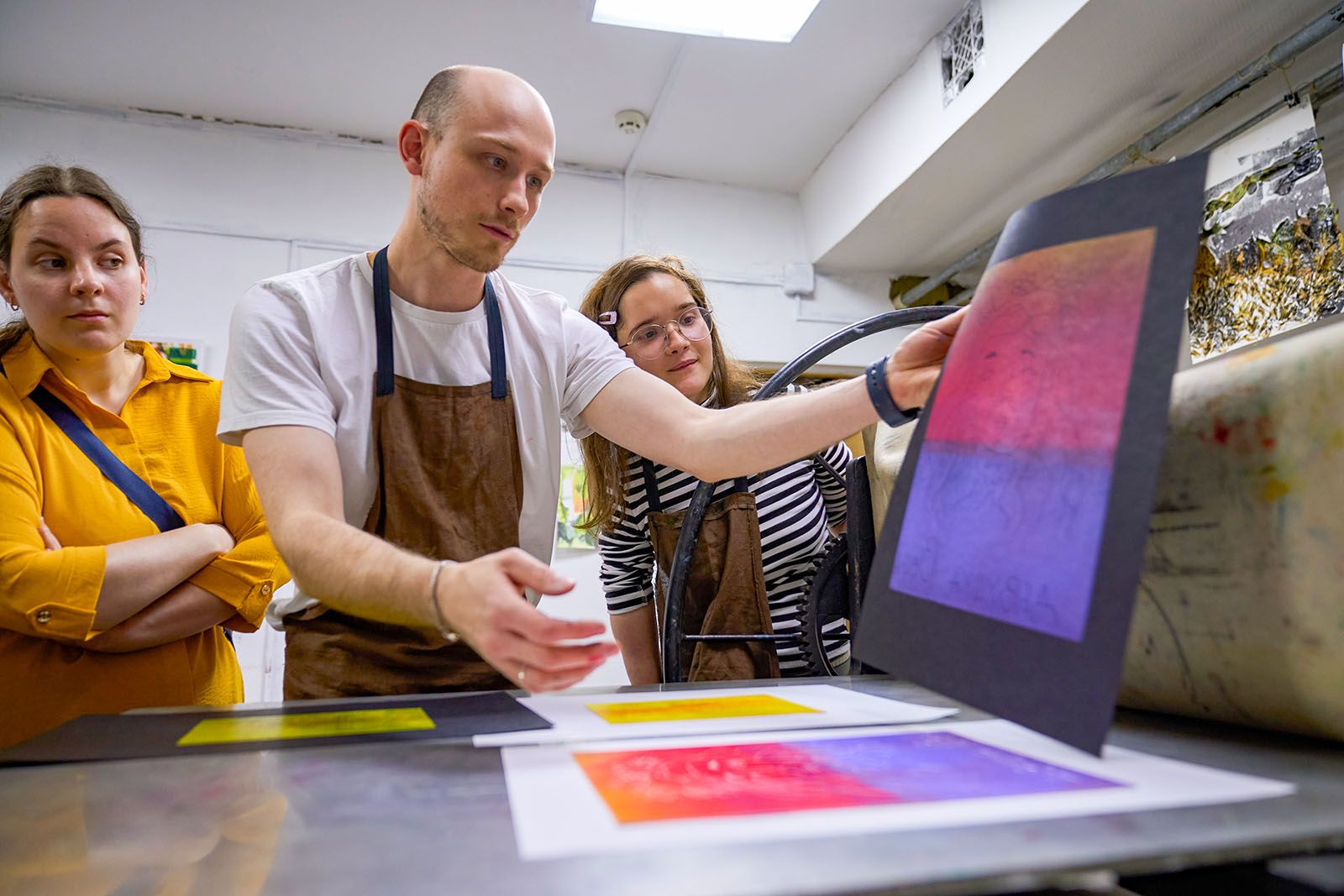 После перерыва на обед начинается вторая часть занятия. Студенты переходят в соседнее помещение, где установлен офортный станок — универсальный печатный инструмент с ручным управлением. Ребята наносят валиком на свои работы желтую, розовую и фиолетовую краски, затем накрывают их белой или черной дизайнерской бумагой, сверху — фетром и кладут под пресс, вращая большое колесо станка, словно штурвал корабля. На выходе получаются стильные цветные гравюры в белой и черной окантовке.