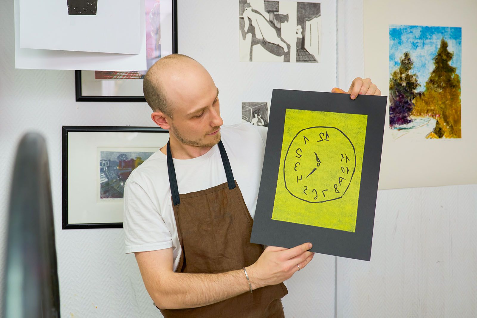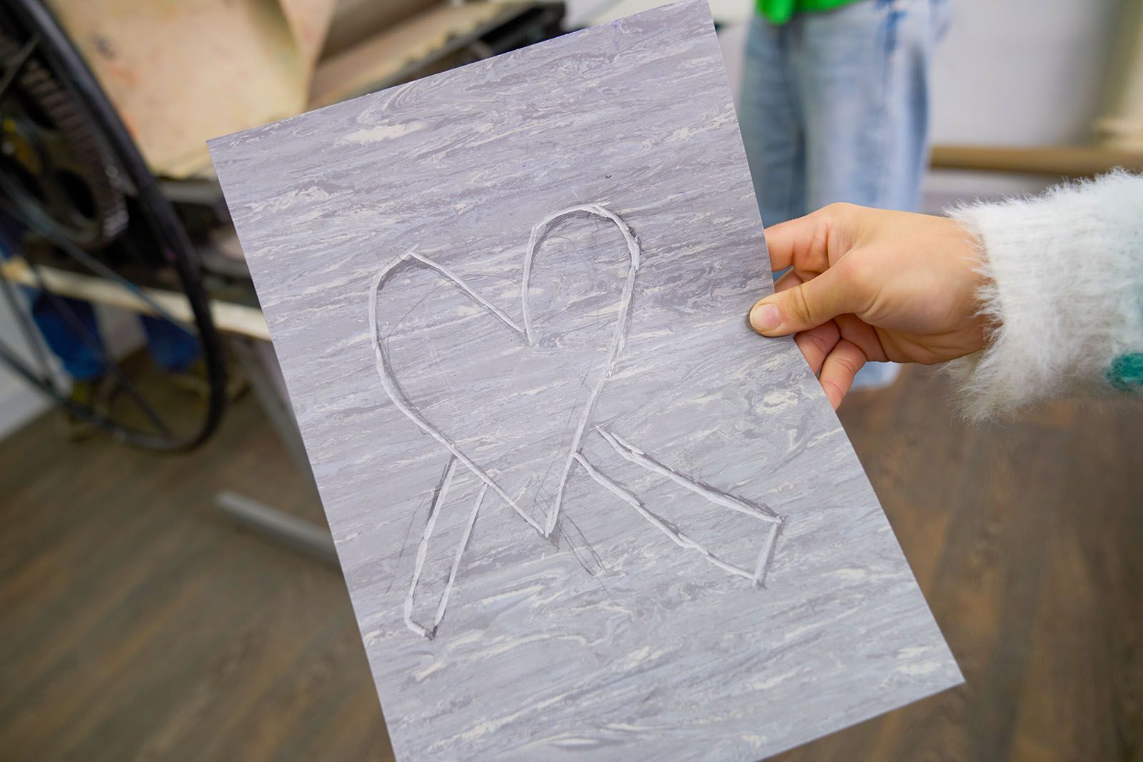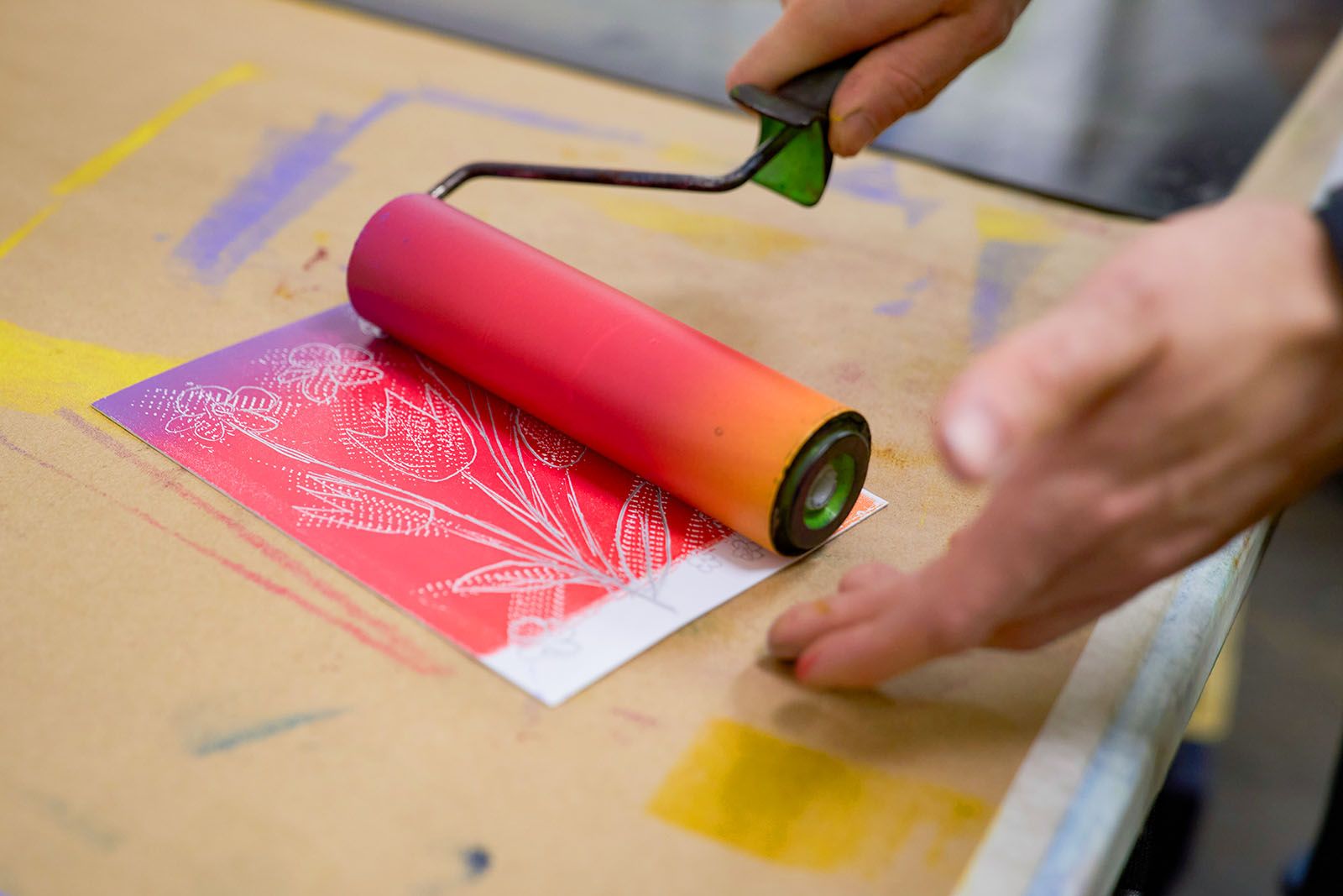 После перерыва на обед начинается вторая часть занятия. Студенты переходят в соседнее помещение, где установлен офортный станок — универсальный печатный инструмент с ручным управлением. Ребята наносят валиком на свои работы желтую, розовую и фиолетовую краски, затем накрывают их белой или черной дизайнерской бумагой, сверху — фетром и кладут под пресс, вращая большое колесо станка, словно штурвал корабля. На выходе получаются стильные цветные гравюры в белой и черной окантовке.