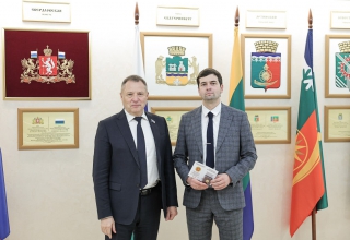 По поручению председателя Законодательного Собрания Людмилы Бабушкиной депутат Вячеслав Вегнер вручил Почётный знак парламента «За заслуги в волонтёрской деятельности» Михаилу Пьянникову и Никите Филимошкину - разработчикам беспилотных летательных аппаратов.