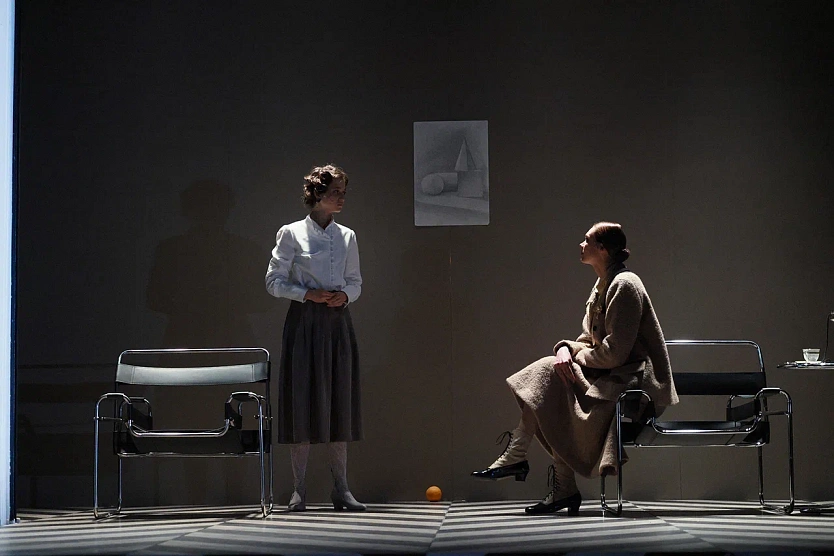 Мотив арт-деко в сценографии (художник — Стефания Филатова), безупречно подходит для той истории, которую складывает из набоковского романа Данай. Разумеется, это своего рода выжимка — так, режиссёр жертвует русским эмигрантским сюжетом в пользу истории болезни гениального чудака-шахматиста Лужина. Варварский дух «а-ля рюс» (с кулебяками, самоварами и кокошниками на балу), которым у Набокова проникнута эмигрантская жизнь русских в Берлине, заменён на педантичный дизайнерский ретро-стиль. Геометричный чёрно-белый узор по планшету сцены, тонконогие столик и кресла под Bauhaus, матовый серый цвет портала, наконец, шрифт титров, озаглавливающих картины, скорее говорят о хорошем вкусе создателей спектакля, чем передают живую фактуру описанных в романе событий. В оформлении читается связь с киноэстетикой — глянцевым нуаром фильмов Хичкока или Орсона Уэллса, сюрреалистичной готикой «Лолиты» Стэнли Кубрика (снятой, впрочем, по сугубо «американскому» произведению Набокова).