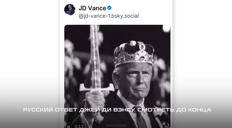 Появился русский ответ вице-президенту США Джей Ди Вэнсу, который недавно разместил на своей странице в BlueSky сгенерированный нейросетью ролик, изображающий американского лидера Дональда Трампа в короне. Альтернативное видео в своём Telegram-канале опубликовал учредитель канала Царьград Константин Малофеев.