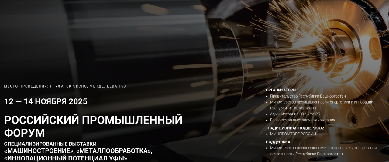 Приглашаем вас принять участие в ключевом событии для промышленной отрасли — Российском промышленном форуме, который пройдет с 12 по 14 ноября 2025 года в г. Уфе. Мероприятие объединит масштабную деловую программу и специализированные выставки «Машиностроение. Металлообработка».