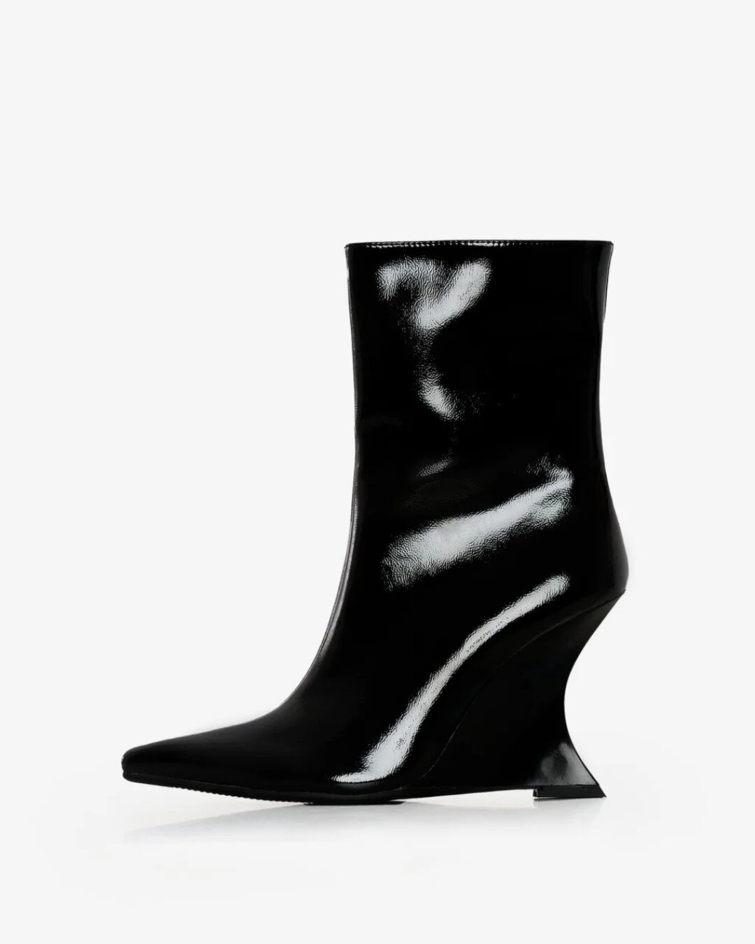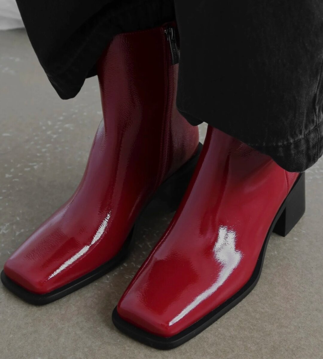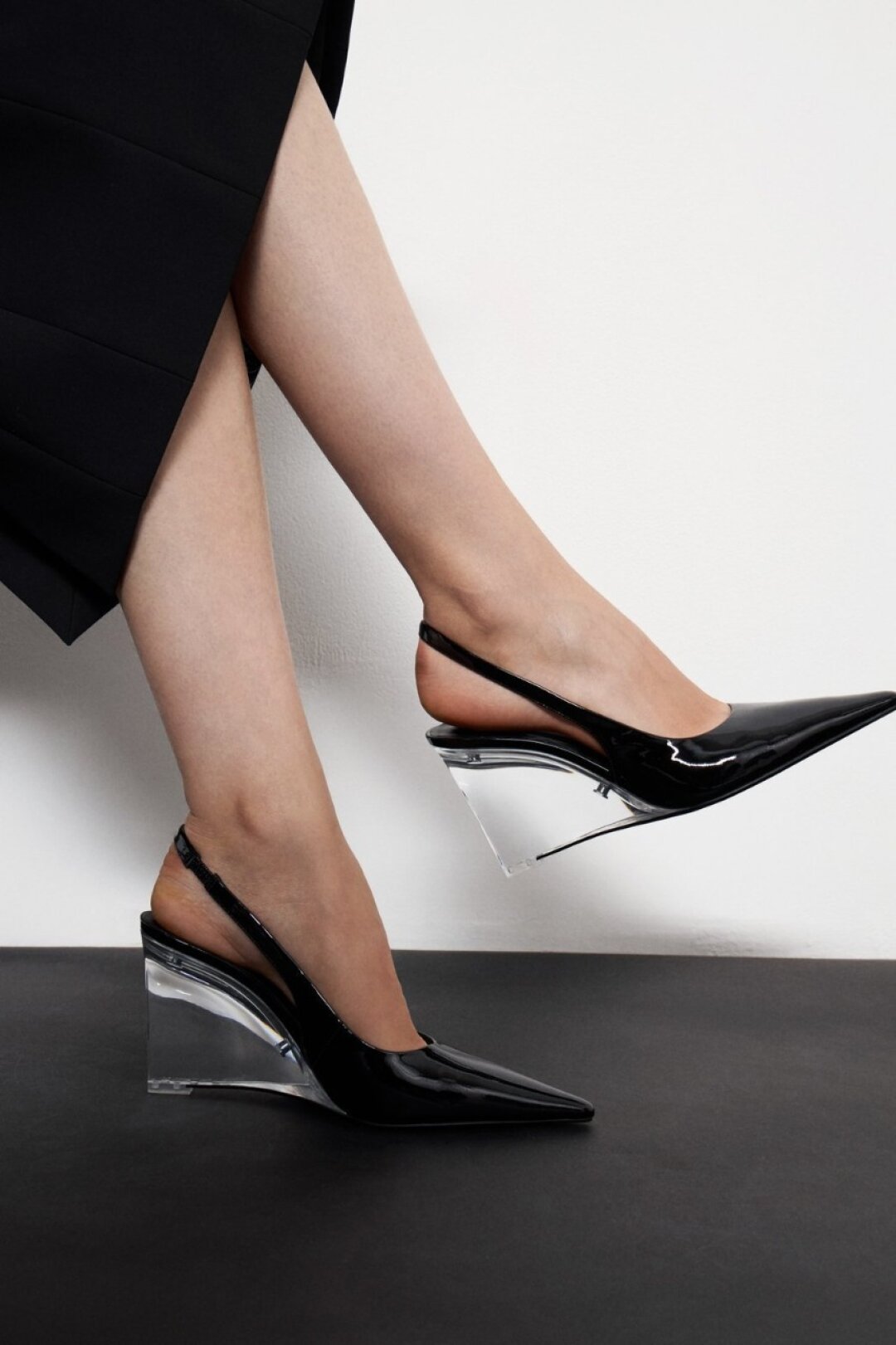 Главный каблук года — танкетка: с одобрения Alaia, Chloe и Saint Laurent примеряем остроносые ботильоны из лакированной кожи Wysh в сочетании с ультрамодными джинсами-буткатами, в офисе переобуваемся в бургунди-балетки Povod, а для предновогоднего фэшн-марафона забираем полосатые вау-туфли Christian Louboutin и слингбэки с прозрачной танкеткой Lime.