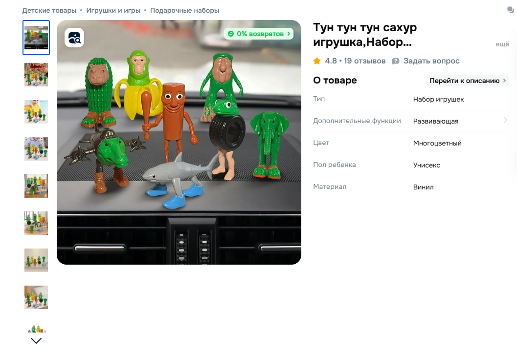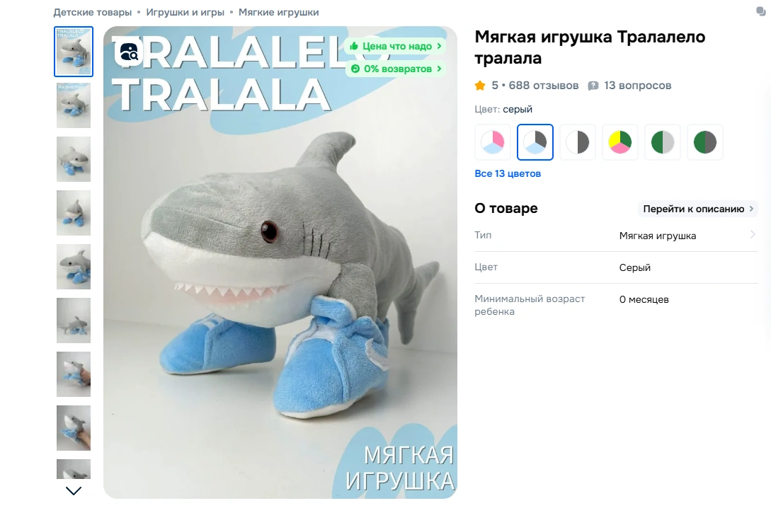 На маркетплейсах можно найти как мягкие игрушки с персонажами brainrot-мемов, так и канцелярию. Стоимость варьируется от 200 рублей до 3000 рублей.