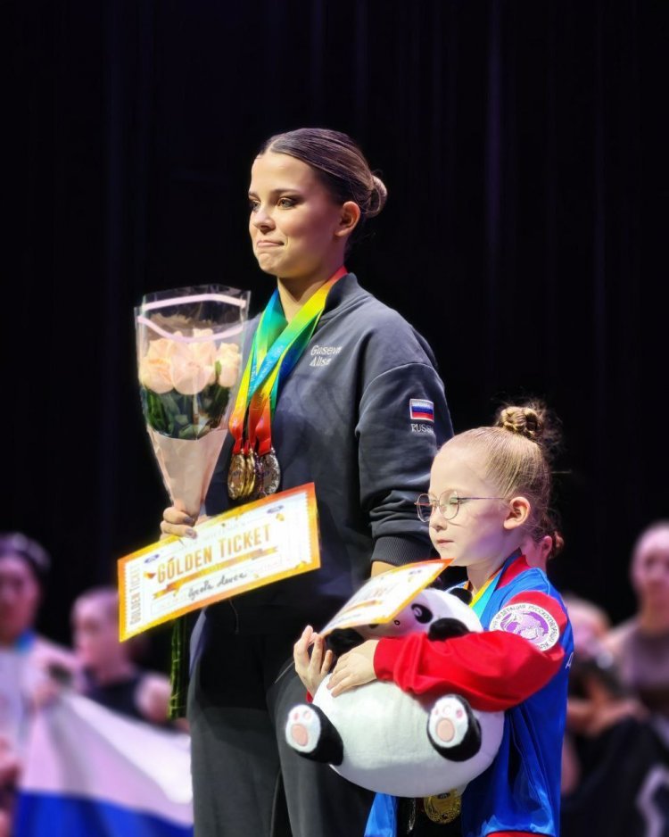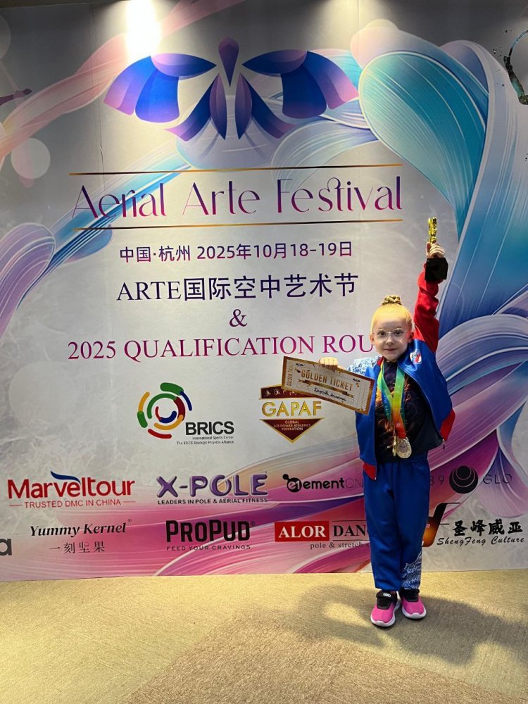 Кроме того, оренбурженка Ясмина Даутова взяла в Китае специальный приз фестиваля — «Золотой билет». Девочка показала номер на на полотнах, который сочетал в себе акробатику, гибкость, силу и художественное выражение.
