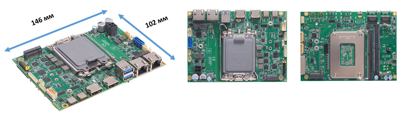 Этот одноплатный компьютер - флагманское производительное решение. Он оборудован сокетом LGA1700 и поддерживает десктопные процессоры 12/13-го поколения семейства Intel Core-i3/i5/i7 c TDP до 35 Вт. Устройство оснащено памятью стандарта DDR5 объёмом до 64 ГБ. Кроме того, предусмотрена одновременная работа с четырьмя независимыми дисплеями через HDMI и DisplayPort и внутренний интерфейс eDP для подключения дисплеев. Устройство имеет два порта с поддержкой 2,5 Гбит/с и 1 порт с 1 Гбит/с. Что касается хранения данных, то предусмотрена поддержка SATA 2.5” и M.2 ключ M. Расширение функционала доступно через слоты M.2 с ключами E и B.