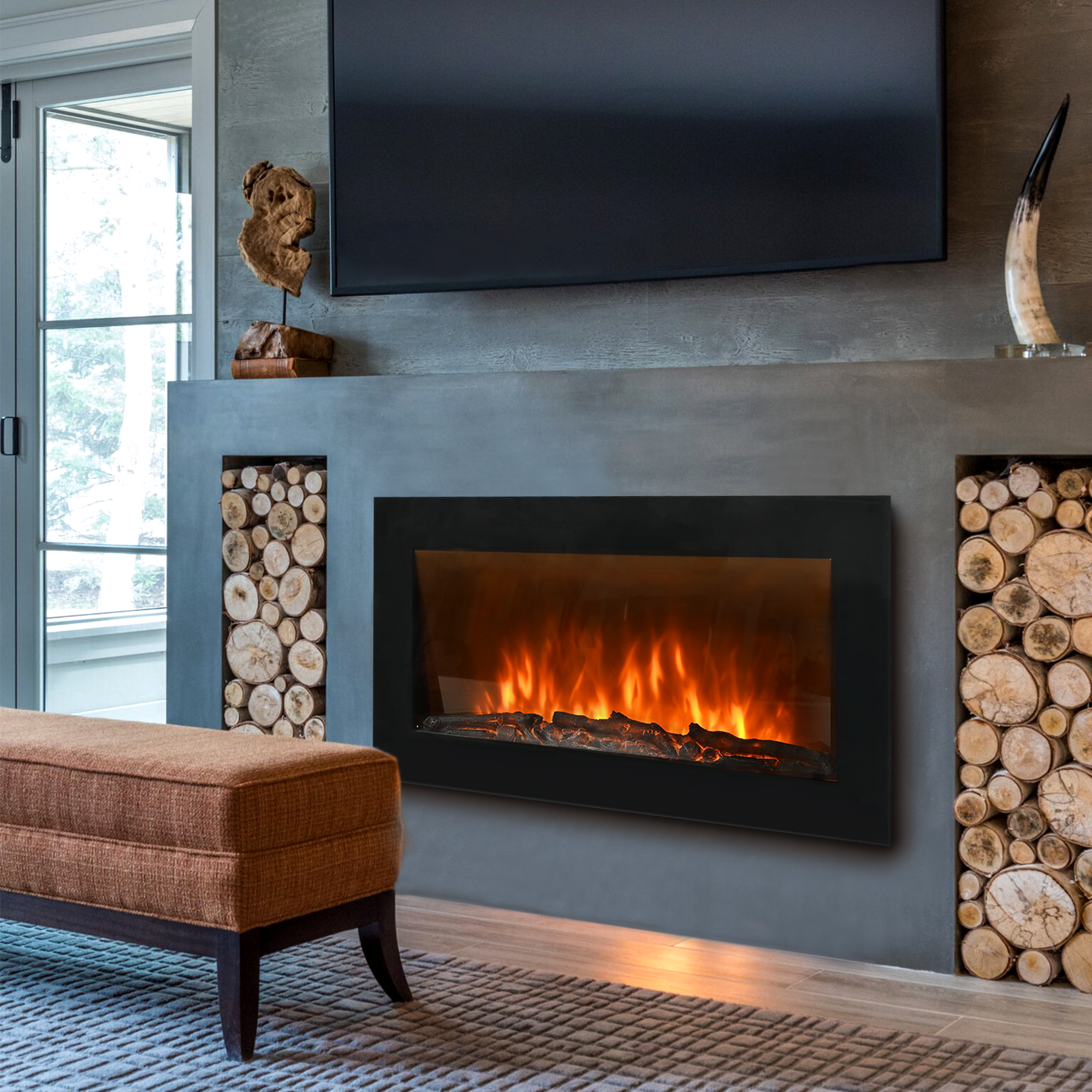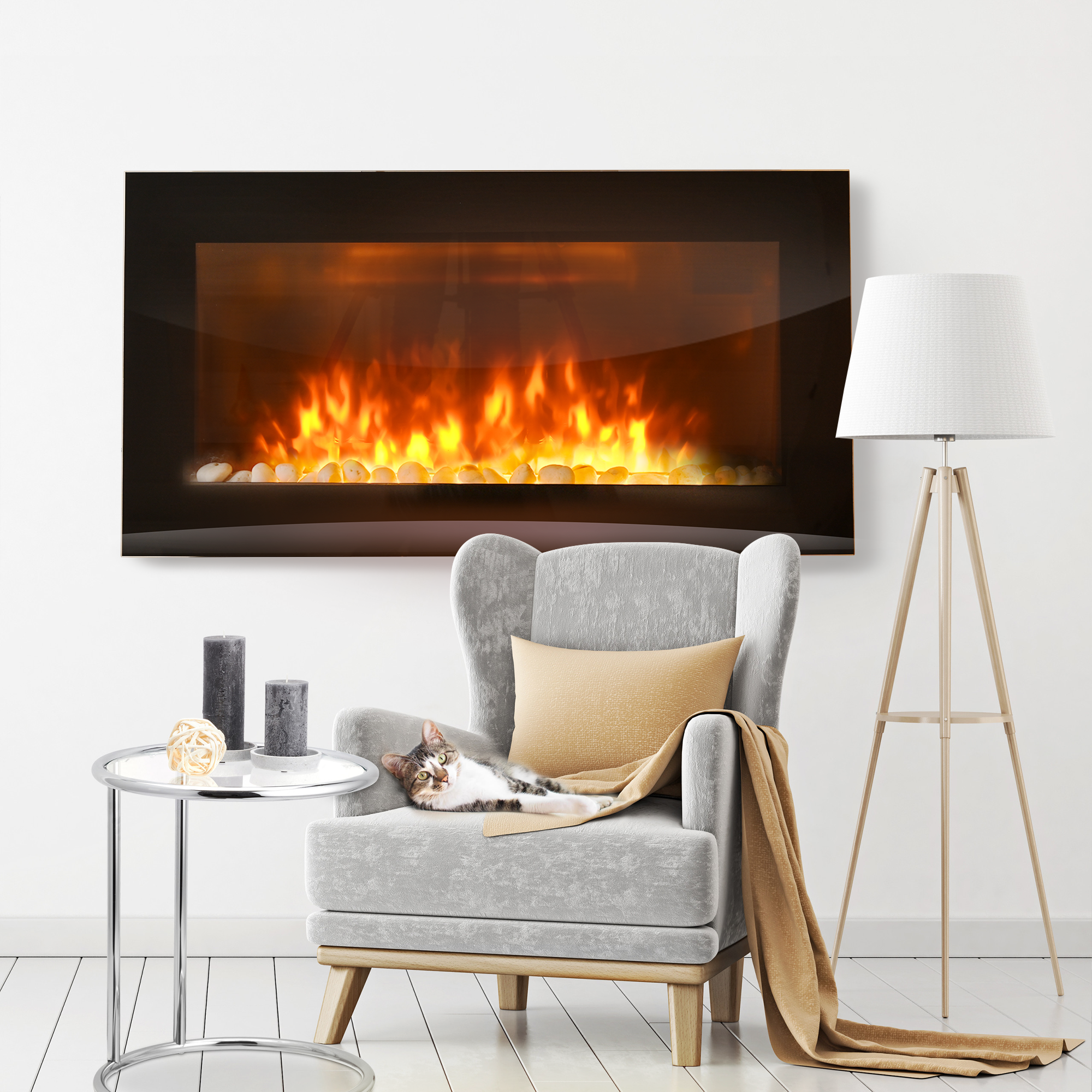 Настенный электрический камин PFP-WM090 SLIM отлично дополняет любой интерьер. В зависимости от настроения можно изменить декоративное топливо – белые камни или имитация дров.