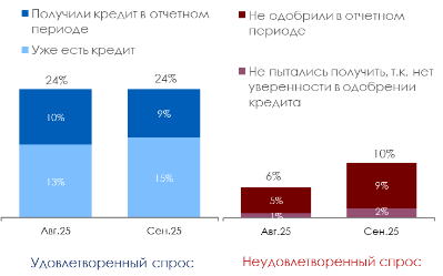 В целом спрос на кредиты со стороны компаний вырос на фоне смягчения денежно-кредитной политики: доля МСП, уже имеющих кредит, достигла максимума за последние восемь месяцев, составив 15% (+2 п.п.).