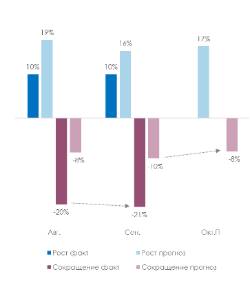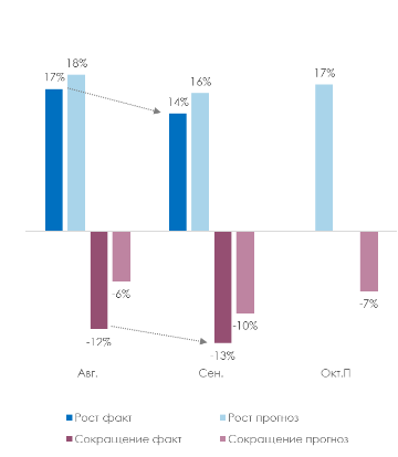 Некоторое улучшение в компоненте было обеспечено небольшим ростом позитивных ожиданий компаний в части кадров: доля тех, кто планирует сокращение штата, вернулась к июльскому уровню (8%, — 2 п.п.).