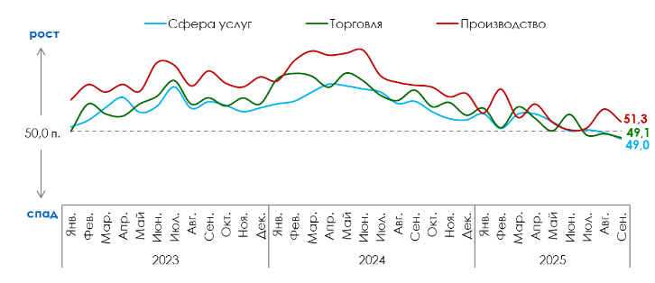 Индекс торговли составил 49,1 пункта (-0,6 п.п.), показав отрицательную динамику из-за снижения доступности кредитов и ухудшения ожиданий по выручке.