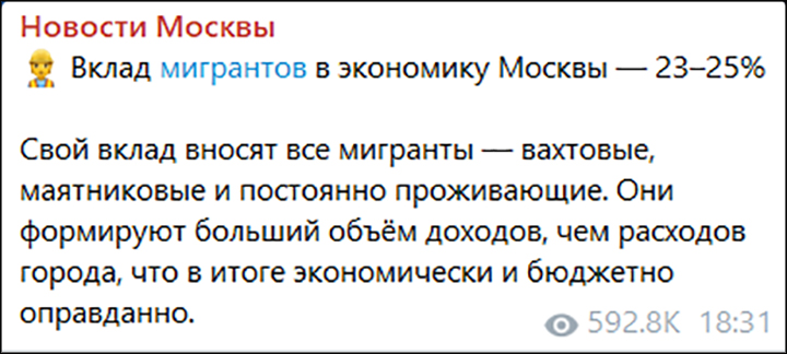 И лишь вчитавшись в материал, человек понимает: речь идёт в том числе о так называемых "внутренних мигрантах". То есть гражданах России, работающих в Москве временно или постоянно. Все жители соседних регионов, которые ездят на заработки в Первопрестольную, вахтовые рабочие с Урала и Сибири, вообще все наши соотечественники, имеющие отношение к московской экономике. Но какие же они "мигранты"? С научной точки зрения их, конечно, можно так обозвать, но представлять в СМИ совершенно не корректно. Слово "мигранты" ассоциируется в медиа практически исключительно с приезжими из бывших советских республик.