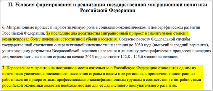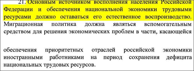 Поглядите, к примеру, что говорилось в предыдущем программном документе. Он действовал с 2012 по 2025 год. Замещающая миграция прямо называлась благом для страны: ведь циферка общей численности населения при этом растёт! А такую цифирь и наверх подать не стыдно.