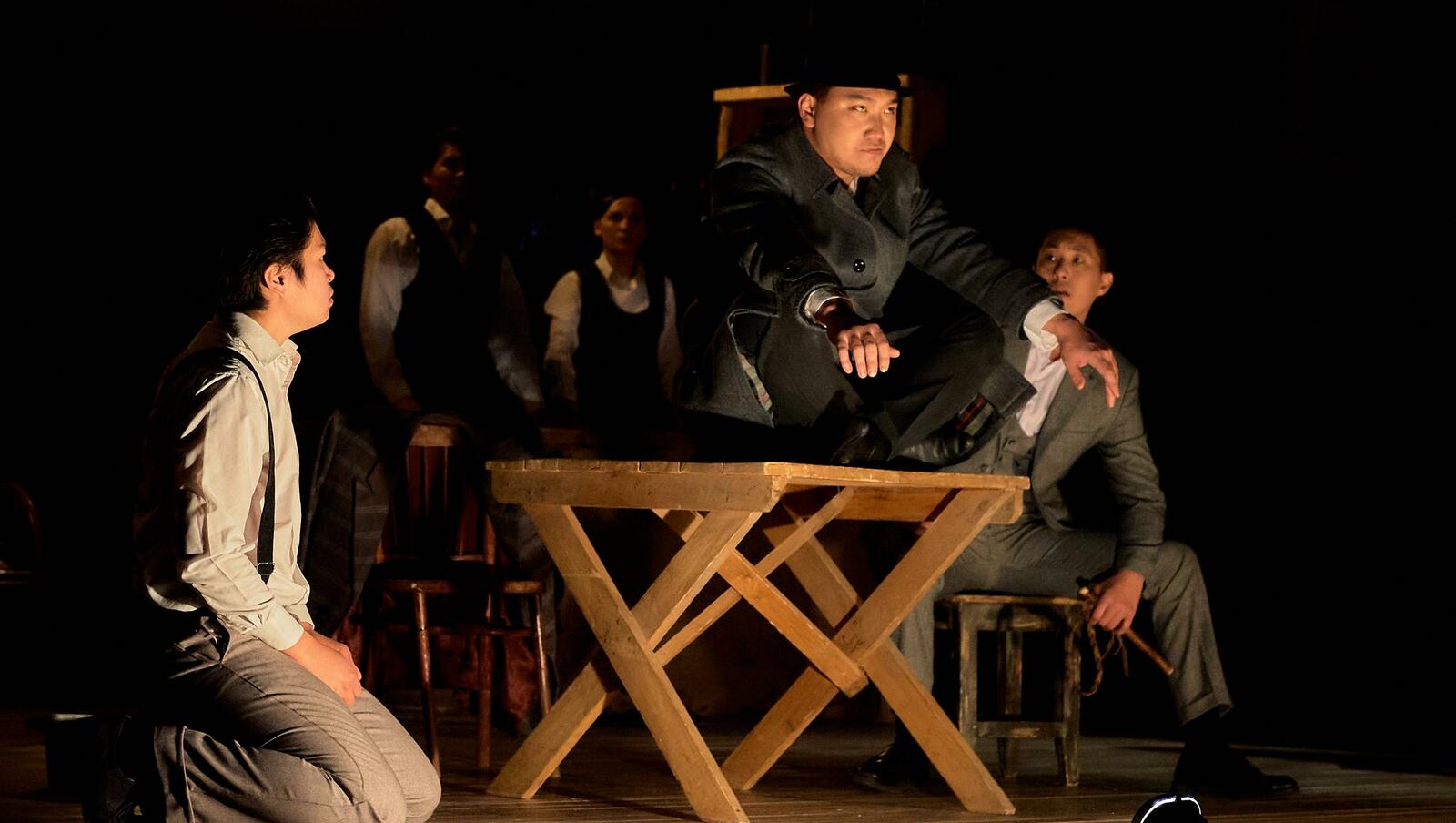 Кулов не случайно определяет жанр трагедии как вестерн. Еще до начала спектакля в кресле-качалке дремлет персонаж в длинных, похожих на ковбойские, сапогах (Ерсайн Нуриманов). Убогая барная стойка, разномастная мебель забегаловки, некрашеные деревянные стены… Такой «салун» мог быть как на Аляске времен Джека Лондона, так и в другом захолустье любого уголка планеты. Резко распахивается дверь и, под завывания вьюги, в клубах морозного пара, врывается банда. Они мечутся по закрытому пространству, согреваются, вздрагивают от резких звуков, дерутся. Среди них выделяется особой статью и жестким взглядом главарь. И только когда эти непонятные персонажи начинают жадно хлебать пищу, поданную барменом прямо из тазиков, становится ясно, что это стая волков. Трансформации люди-волки-собаки происходят в постановке мгновенно, и ты искренне ВЕРИШЬ в эти метаморфозы. Роль волчонка здесь запросто, например, может исполнить шляпа Лютого. Веришь и в это потрясающее превращение. Вот она — настоящая магия театра! А какая сильная и одновременно ужасная до слез сцена родов Белой волчицы и последующее убийство ее волчат группой охотников... Лютый (Мадияр Жакып) начинает жестоко мстить.