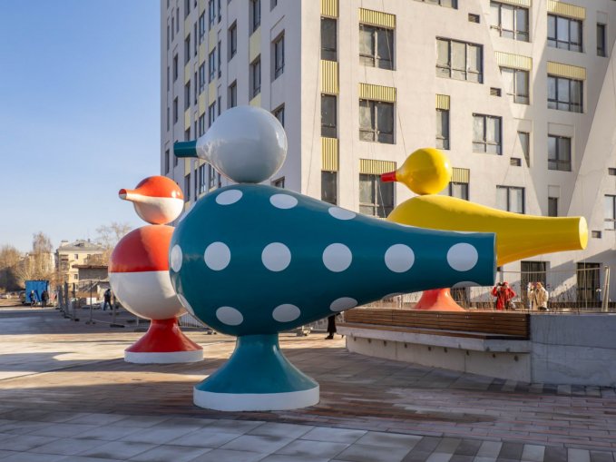 В Екатеринбурге по адресу: улица Репина, 24, появился новый арт-объект. Это продолжение проекта BIRDWATCHIN Андрея Люблинского. На ВИЗе художник представил три скульптуры в виде уточек, которые по форме напоминают детские свистульки-птички. Именно они несколько лет назад вдохновили художника на создание первого арт-объекта.