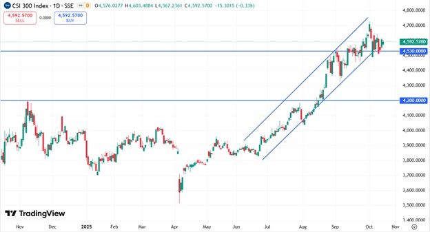 Индекс CSI 300 удерживается выше уровня 4530 пунктов. Сохранение этого уровня откроет путь к росту в район 4700 пунктов, а пробой вниз может привести к снижению к 4200 пунктов.