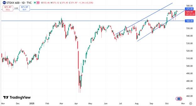 Индекс STOXX 600 торгуется на уровне 571,9 пункта. Индекс остается в узком диапазоне 560-575 пунктов, что указывает на фазу консолидации после продолжительного роста. В ближайшие недели индекс, вероятно, продолжит колебаться в этих границах без выраженного направления.