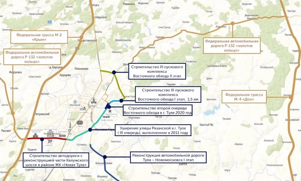 В частности, кроме ранее анонсированного продления Восточного обхода Тулы до улицы Вильямса (Северо-восточный микрорайон) на схеме можно увидеть и 2-й пусковой комплекс III этапа строительства этого объекта. Он должен пройти через Щегловскую засеку, Комарки, пересечь федеральную трассу Р-132 «Золотое кольцо» и выйти на Московское шоссе между посёлками Октябрьский и Горелки.