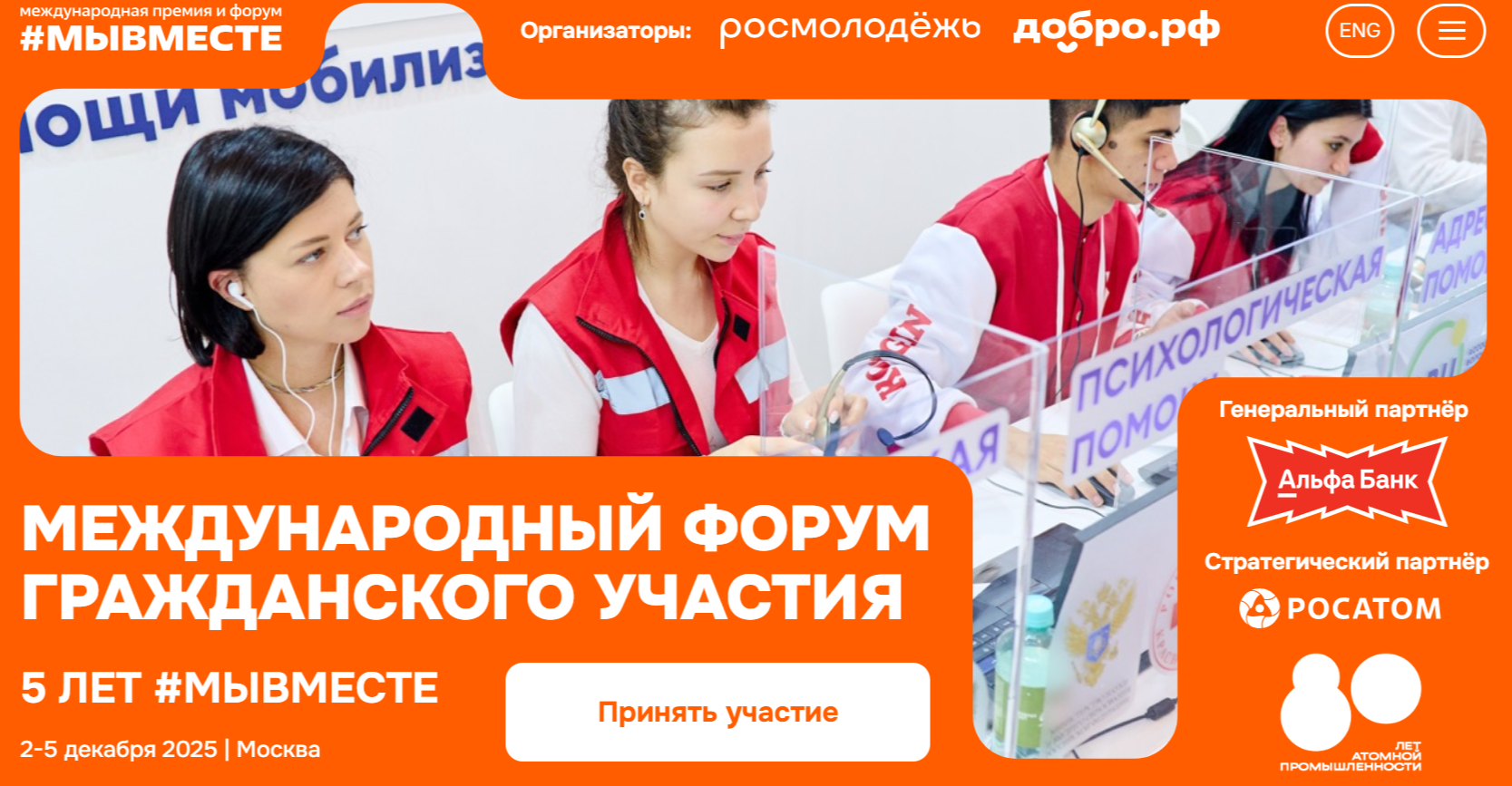 В период с 02 по 05 декабря 2025 года в Национальном центре «Россия» города Москва состоится Международный форум гражданского участия #МВВМЕСТЕ с вручением Международной премии за вклад в развитие гражданского общества и решение социальных проблем «#МЫВМЕСТЕ» (далее – Форум) форум.мывместе.рф/