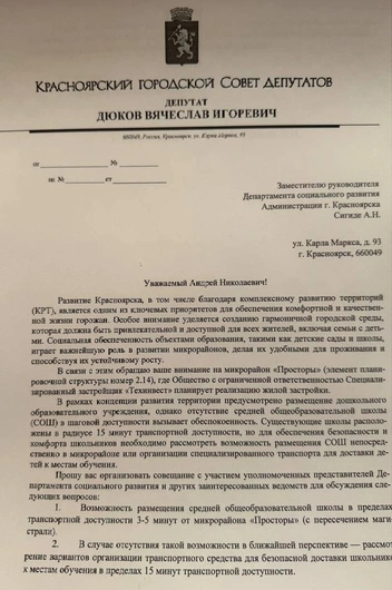 Письмо Вячеслава Дюкова в адрес администрации Красноярска