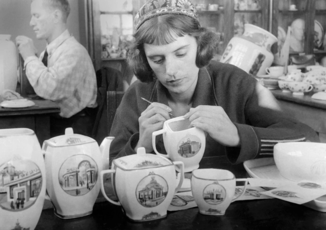 Работа художницы Анны Яцкевич над росписью сервиза на Императорском фарфоровом заводе в 1940-е годы