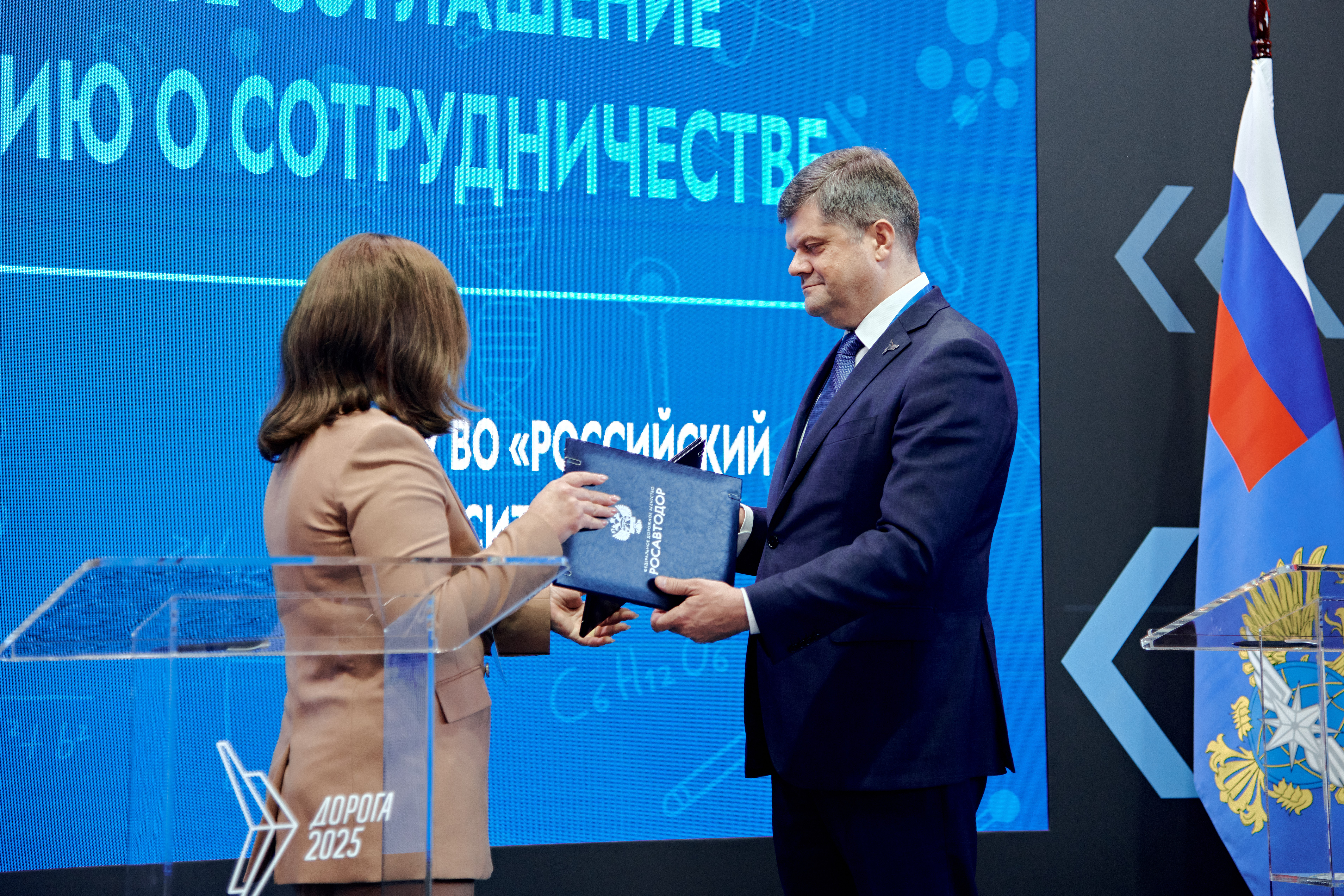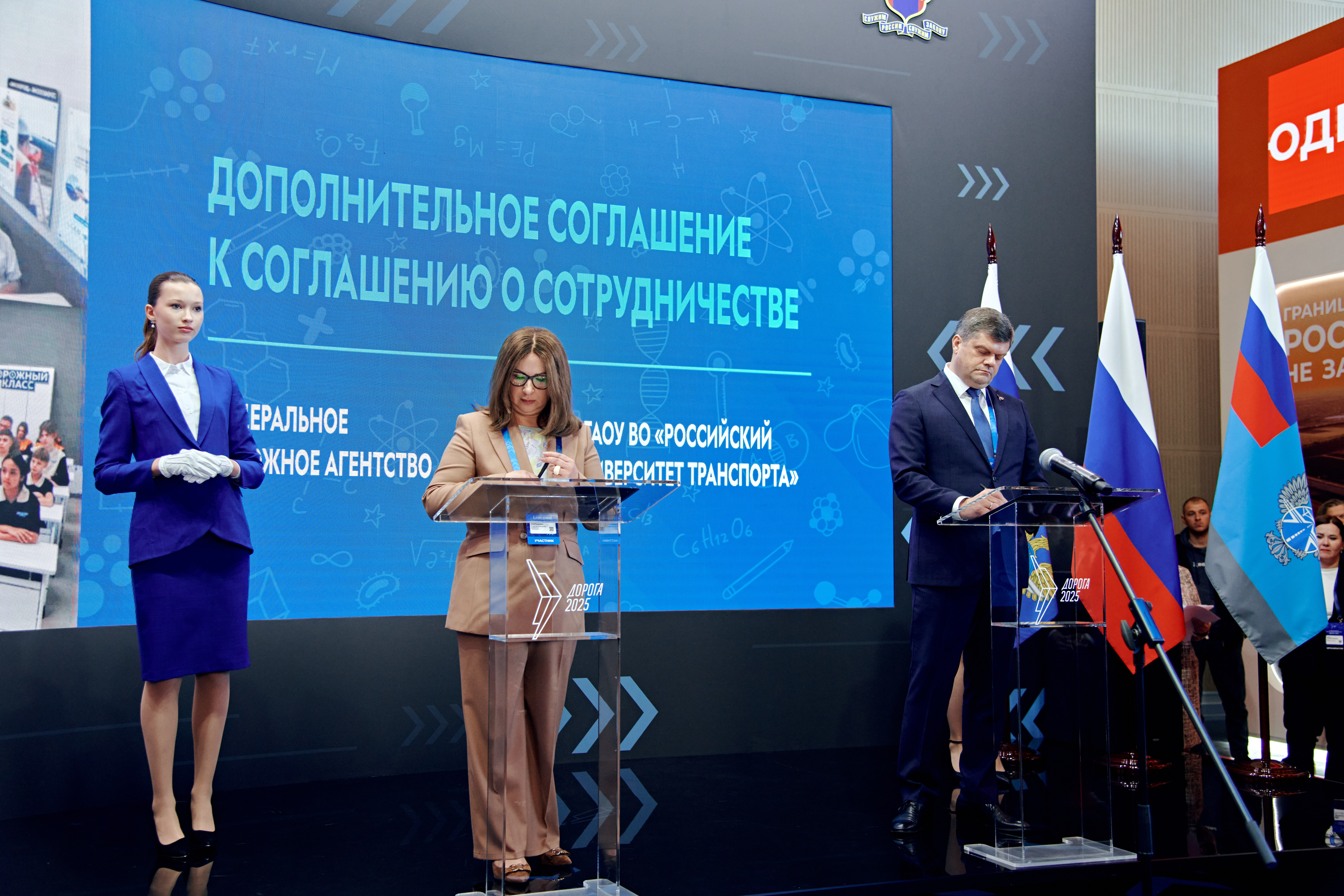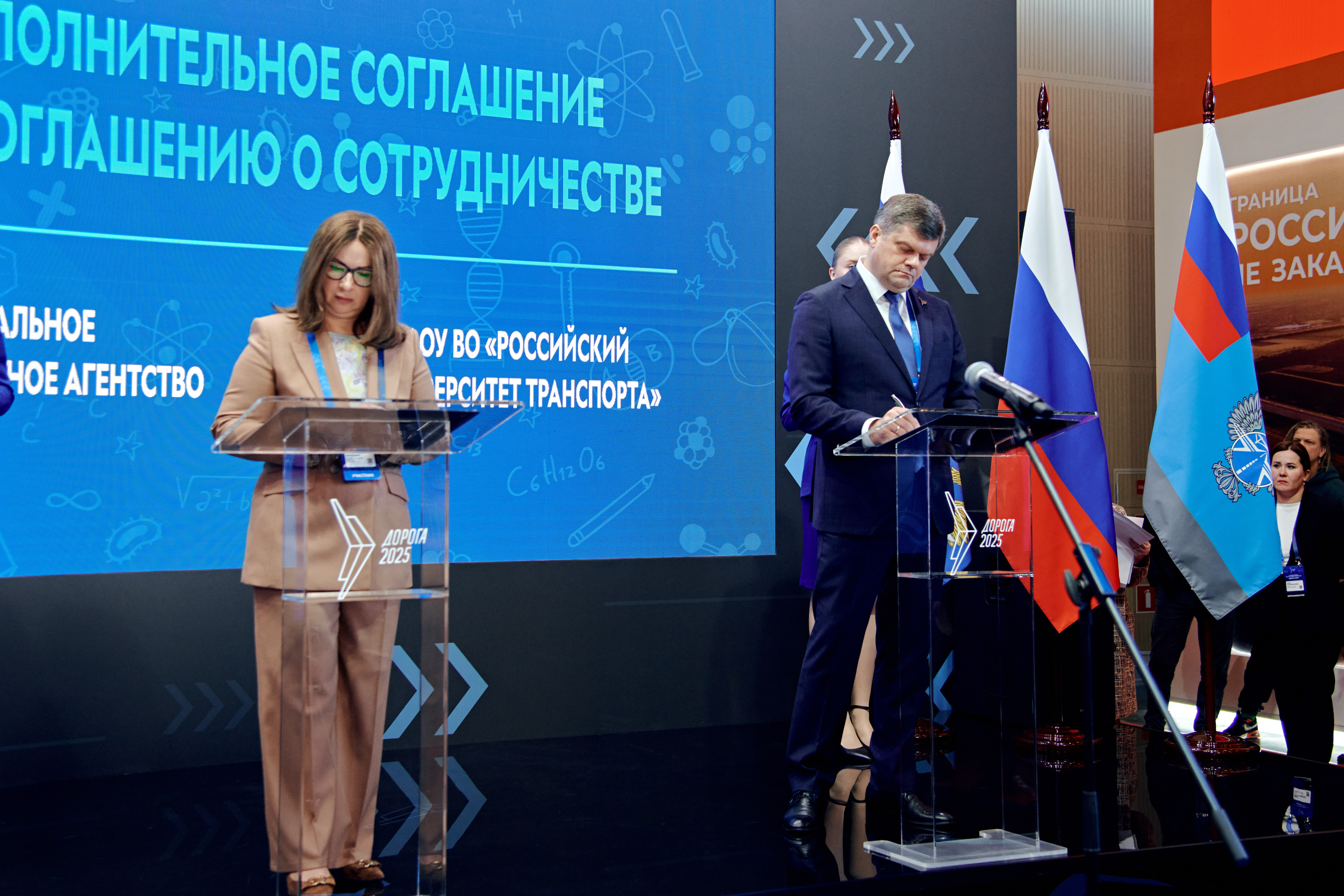 Также в рамках мероприятия состоялась церемония подписания Дополнительного соглашения к Соглашению о сотрудничестве между Федеральным дорожным агентством и Федеральным государственным автономным образовательным учреждением высшего образования «Российский университет транспорта». Свои подписи под документом поставили заместитель руководителя Федерального дорожного агентства Олег Ступников и проректор Российского университета транспорта, доцент кафедры «Теория права, гражданское право и гражданский процесс» Юридического института Татьяна Марканич.
