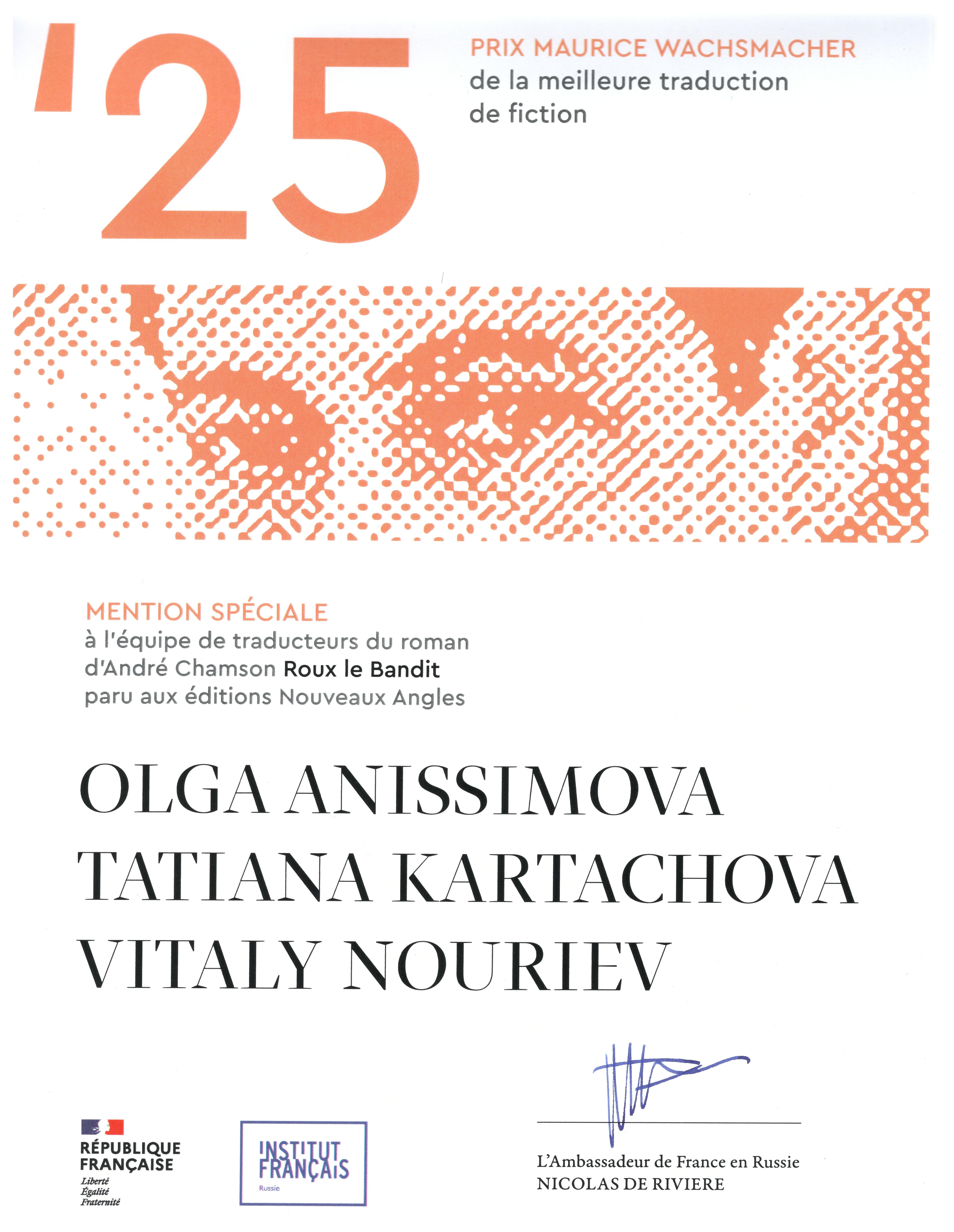 В номинации «Лучший перевод художественной литературы» Виталий Александрович Нуриев удостоился особого упоминания в составе редакционного коллектива за работу над переводом романа Андре Шамсона «Ру-бандит», который вышел в издательстве Nouveaux Angles.