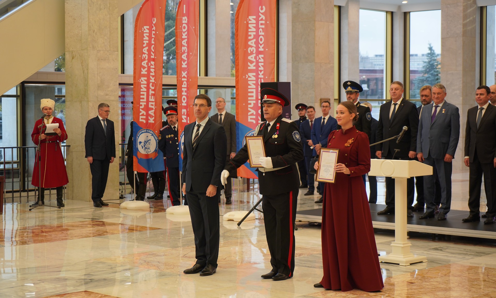 Первый заместитель Министра просвещения Российской Федерации Александр Бугаев зачитал приветственное слово Министра просвещения РФ Сергея Кравцова и вручил Стародубскому казачьему кадетскому корпусу диплом победителя: