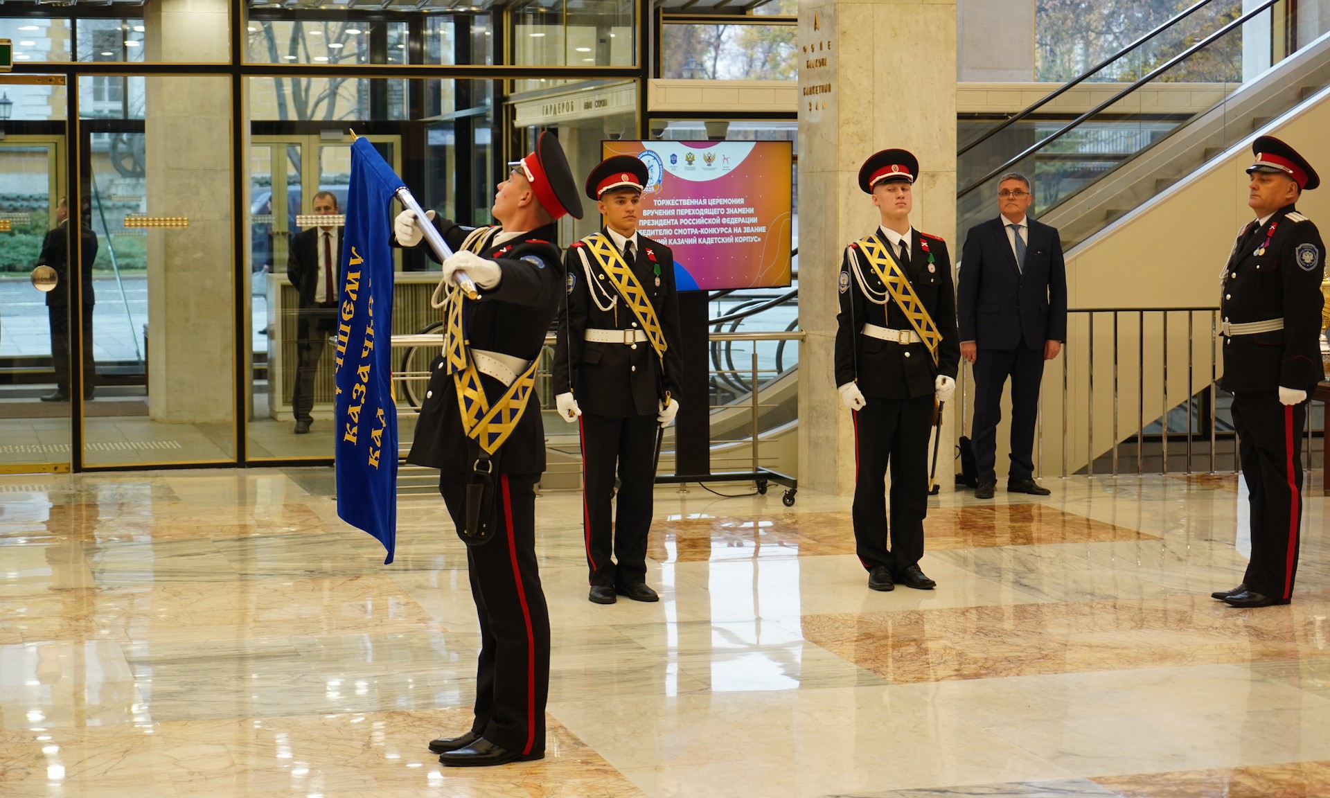 Приветствую всех на торжественной церемонии передачи переходящего знамени Президента Российской Федерации и поздравляю учащихся и преподавателей Стародубского казачьего кадетского корпуса с победой в смотре-конкурсе на звание «Лучший казачий кадетский корпус»!