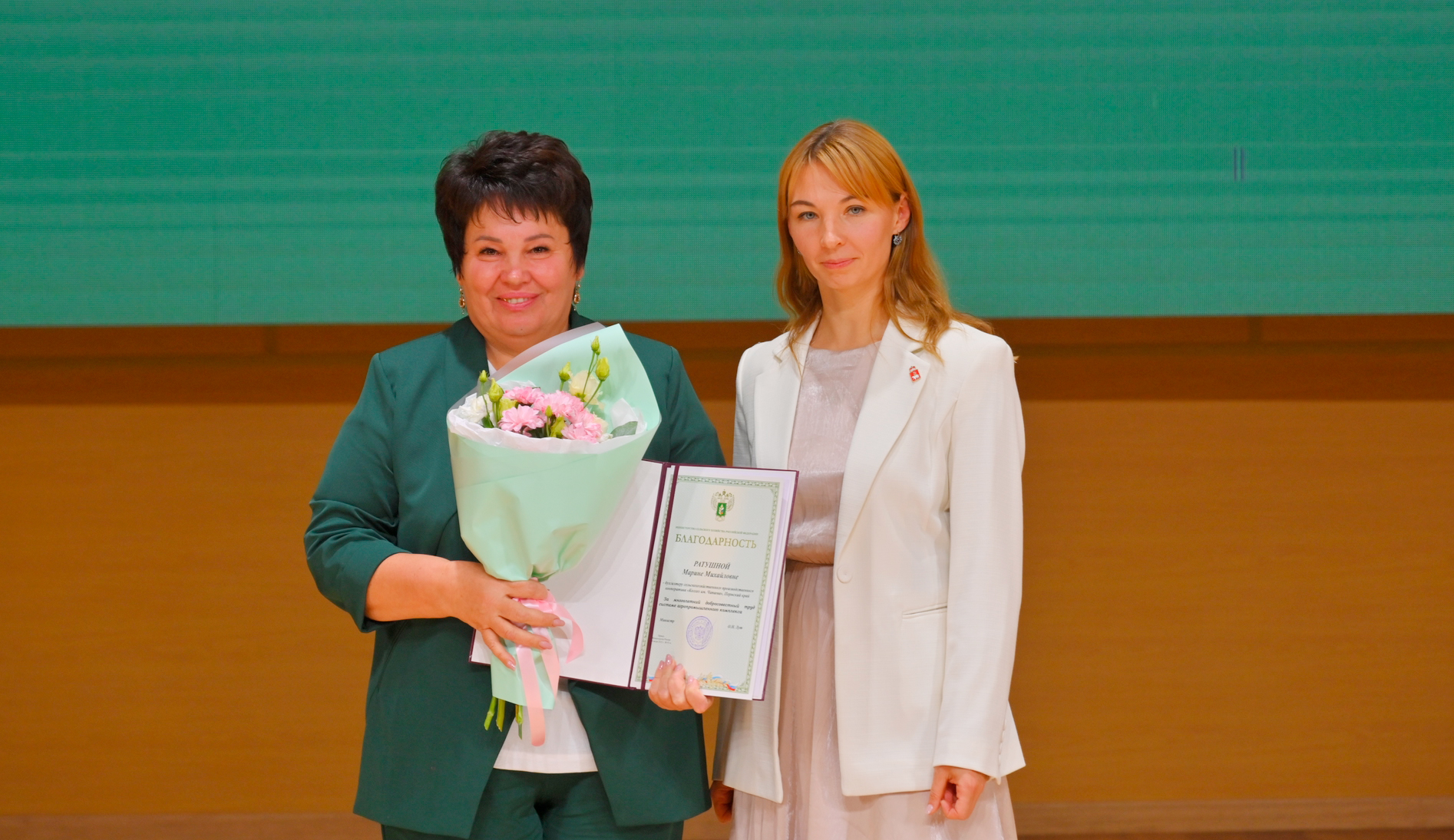 В честь профессионального праздника в Перми состоялось награждение работников сельского хозяйства и перерабатывающей промышленности. Среди награждённых - аграрии Кунгурского округа. Одним из лидеров агропромышленного комплекса Прикамья стал коллектив агрофирмы «Труд». Предприятие вошло в финал конкурса «Лидер Пермского края». Победителем конкурса стала агрофирма «Победа» из Карагайского района, которая в этом году отметила 95-летний юбилей. Финалист номинации - ООО «Агрохолдинг «Труд» - лидер по производству молока в Кунгурском округе. Награду из рук заместителя председателя Правительства - министра промышленности и торговли Пермского края Алексея Валерьевича Чибисова получил директор по производству агрофирмы «Труд» Валерий Николаевич Сухорослов. Предприятие занимается производством и переработкой сельскохозяйственной продукции - молока, мяса, масличных культур, и доставкой до потребителя, в том числе через торговую сеть собственных магазинов «Вкусносытов». Для улучшения создания кормовой базы животных построен элеватор на 15 тысяч тонн, завод по подработке зерновых культур. Ведётся строительство ангаров для хранения семян зерновых культур общим объёмом более 14 тысяч тонн. В 2023 году запущен завод площадью более 500 кв м. по переработке масличных культур. Агрофирма активно участвует в проекте «Профессионалитет» по подготовке рабочих кадров в аграрной отрасли. Заместитель председателя краевого Правительства Алексей Чибисов (справа) вручил награду директору по производству АФ «Труд» Валерию Сухорослову Ещё один проект, вошедший в шорт-лист конкурса, - фермерское хозяйство Олеси Устюговой «Улитки не за горами» из Краснокамского округа. В 2024 году хозяйство выиграло грант «Агростартап». На ферме выращивают улиток Helix aspersa (Мюллера и Максима). Посетители могут увидеть процесс выращивания и попробовать улиток в качестве деликатеса. На заседании Правительства Пермского края 15 октября тоже награждали аграриев. Благодарственными письмами губернатора Пермского края в числе других тружеников награждена доярка Троицкой молочно-племенной фермы СПК «Колхоз им. Чапаева» Елена Никитина. 17 октября на праздничном мероприятии в Перми поздравления звучали от губернатора Пермского края Дмитрия Николаевича Махонина, министра агропромышленного комплекса Пермского края Анны Андреевны Быковой, депутатов Законодательного Собрания. Министр краевого Минагро Анна Быкова (справа) вручила благодарственное письмо представителю колхоза им. Чапаева Марине Ратушной За долголетний добросовестный труд на праздничной сцене наградили сотрудников СПК «Колхоз им. Чапаева»: Марина Михайловна Ратушная отмечена благодарностью Министерства РФ; механизатор Анатолий Иванович Истомин получил благодарность губернатора Пермского края за преданность профессии и стаж работы в сельском хозяйстве, насчитывающий 36 лет. В этот день звучали тёплые слова о самоотверженности работников аграрного сектора, их преданности земле и выбранному делу. Людмила Пятилова Газета «Искра» № 102 (17338) от 18.10.2025 г. Искра_Кунгур©iskra-kungur.ru |