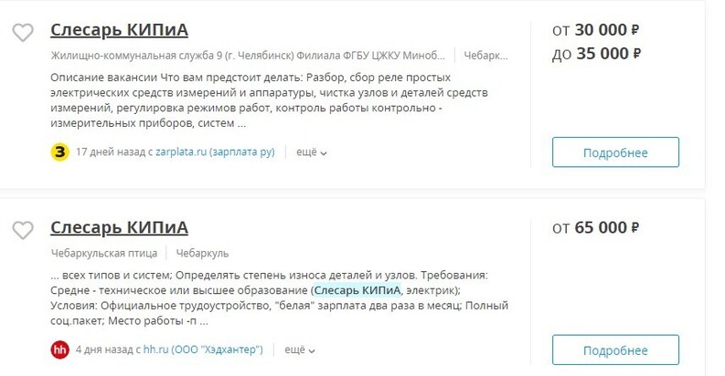 Возьмем свежую вакансию. Для военного городка в Чебаркуле (том самом, который замерзал два года назад) требуется слесарь по контрольно-измерительным приборам и автоматике (КИПиА). Это человек, который занимается выявлением и устранением неполадок в работе аппаратуры, выполнением ремонтных работ и другими задачами, требующими навыков работы с электроникой. Предлагаемая зарплата – 30-35 тысяч рублей.