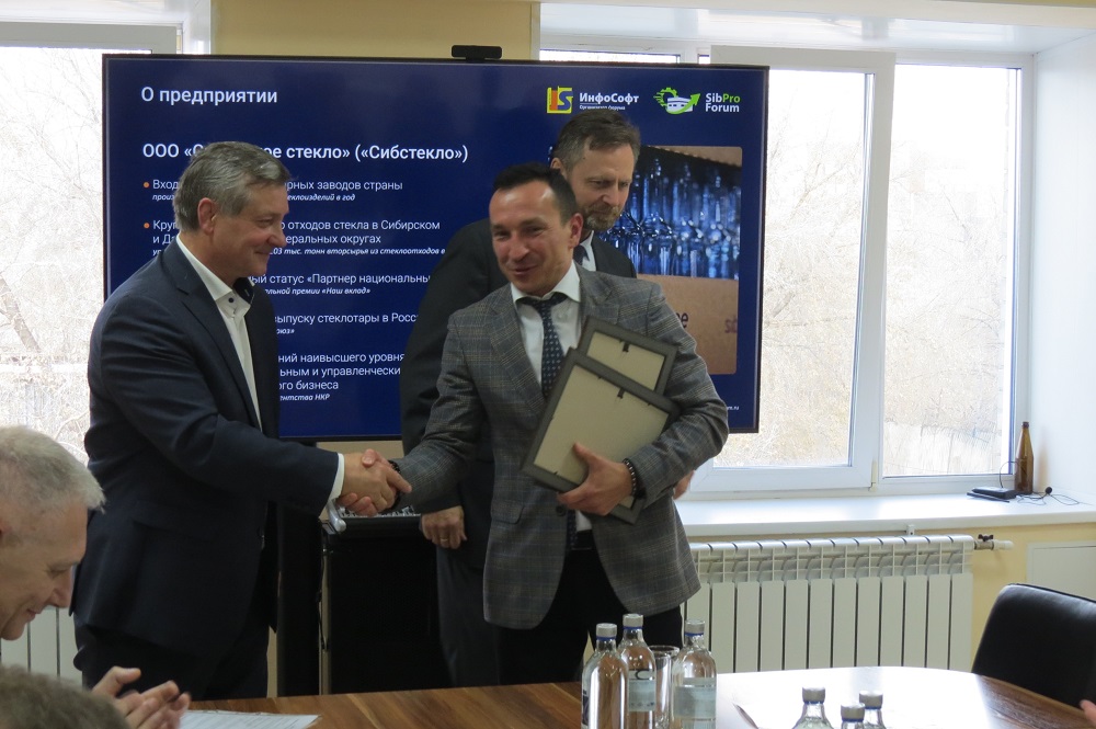 В завершении заседания Юрий Бернадский вручил диплом «За успешное развитие бизнеса в Сибири» руководителю перспективной промышленной площадки компании ООО «Сибирское стекло» Антону Мору за участие в региональных целевых программах и инвестиционных проектах.