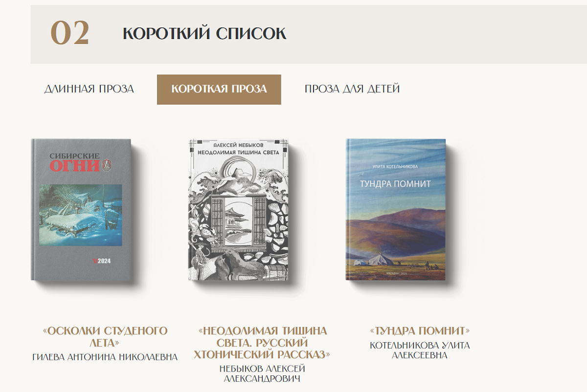 В номинации «Короткая проза» соревнуются Антонина Гилева с книгой «Осколки студеного лета», Алексей Небыков со сборником «Неодолимая тишина света. Русский хтонический рассказ» и Улита Котельникова с произведением «Тундра помнит».